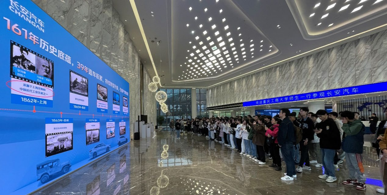 通过参观国内领先的长安智能化汽车总装车间,同学们目睹了汽车主机冲压、焊接、涂装、总装的全制造工艺流程,而这一涉及上万零配件的复杂流程在自动化程度达 92%的生产线加持下,仅需 18 个小时即可完成一辆汽车产品从无到有的全周期过程,并且可实现在一条生产线同时对四款不同车型的柔性化生产。在实地参观全工艺流程后,同学们深受震撼,智能汽车专业的同学纷纷表示他们对汽车制造业自动化、模块化、平台化、标准化、智能化、数字化以及人性化的大趋势有了更为切身的体会。一位市场营销专业的同学则感慨道:“我印象最深的就是长安汽车在介绍的时候提到最多的数字化。长安汽车安排了人员介绍他们的品牌、科研创新,数字化贯穿始终,长安汽车的车身设计,功能优化,都可以很深刻的体会到数字化程度。有一个印象比较深的是长安的阿维塔 2 踩刹车后它的车门可以自动关上,他们的 CHN 平台就是基于数字化的成果。他们的数字化还体现在管理上,平台的打造、数据的监控、数字化的运营,三者的融合,造就了他们的数字化管理。”