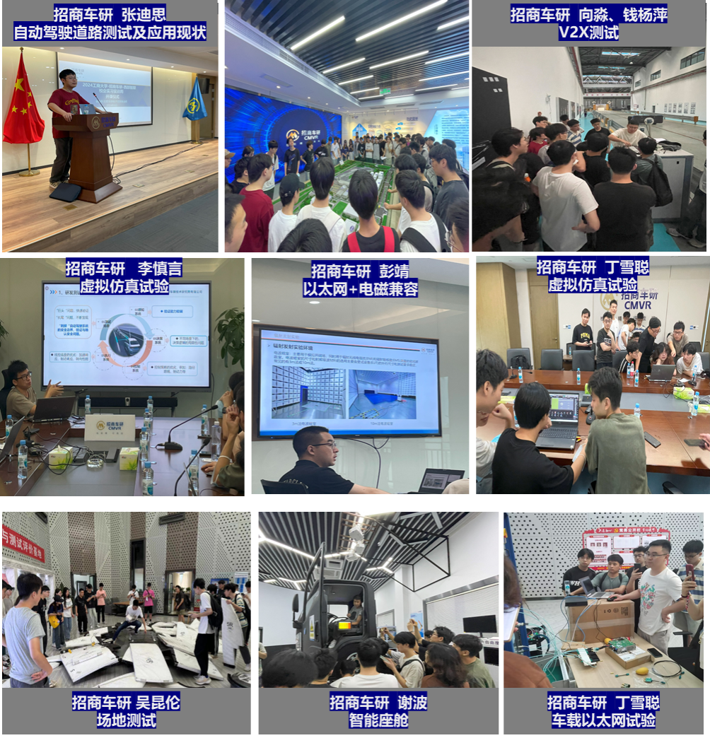 在招商车研金凤基地,同学们参观了碰撞大厅和试验场地,并亲自动手组装了GST假车、调试配置了V2X测试设备。此外,招商车研的工程师们为同学们带来了生动有趣且实用的课程。其中,张迪思老师介绍了本次培训的总体安排、实习目的、课程大纲及相应的实习岗位需求;谢波老师讲解了智能座舱人机交互试验、驾驶员状态监测试验;曾志鹏老师指导了车载以太网试验;彭靖老师指导了电磁兼容试验;丁雪聪老师和李慎言老师指导了虚拟仿真实验;向淼老师和钱杨萍老师指导了车载紧急呼叫系统试验;吴昆伦老师指导了场地测试试验。