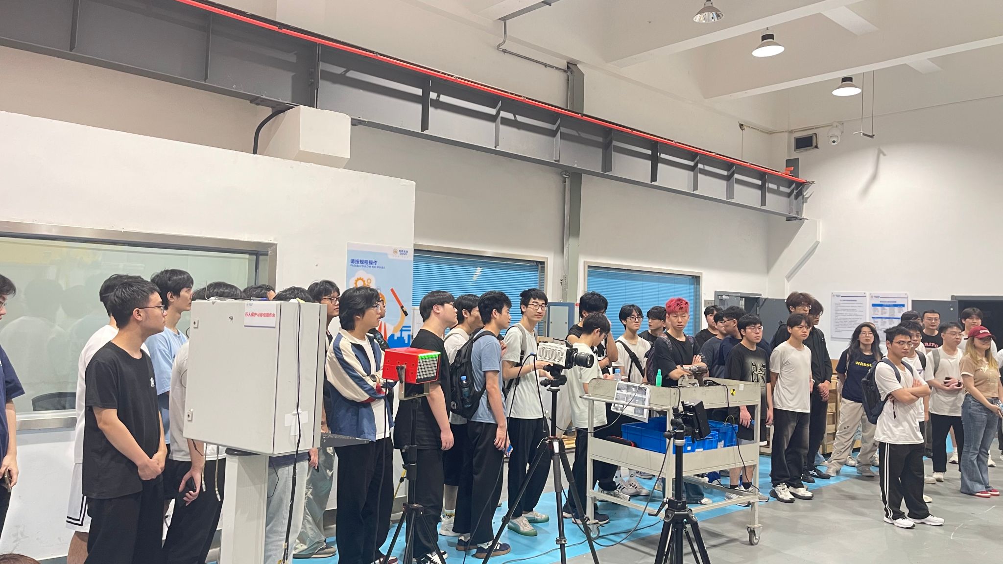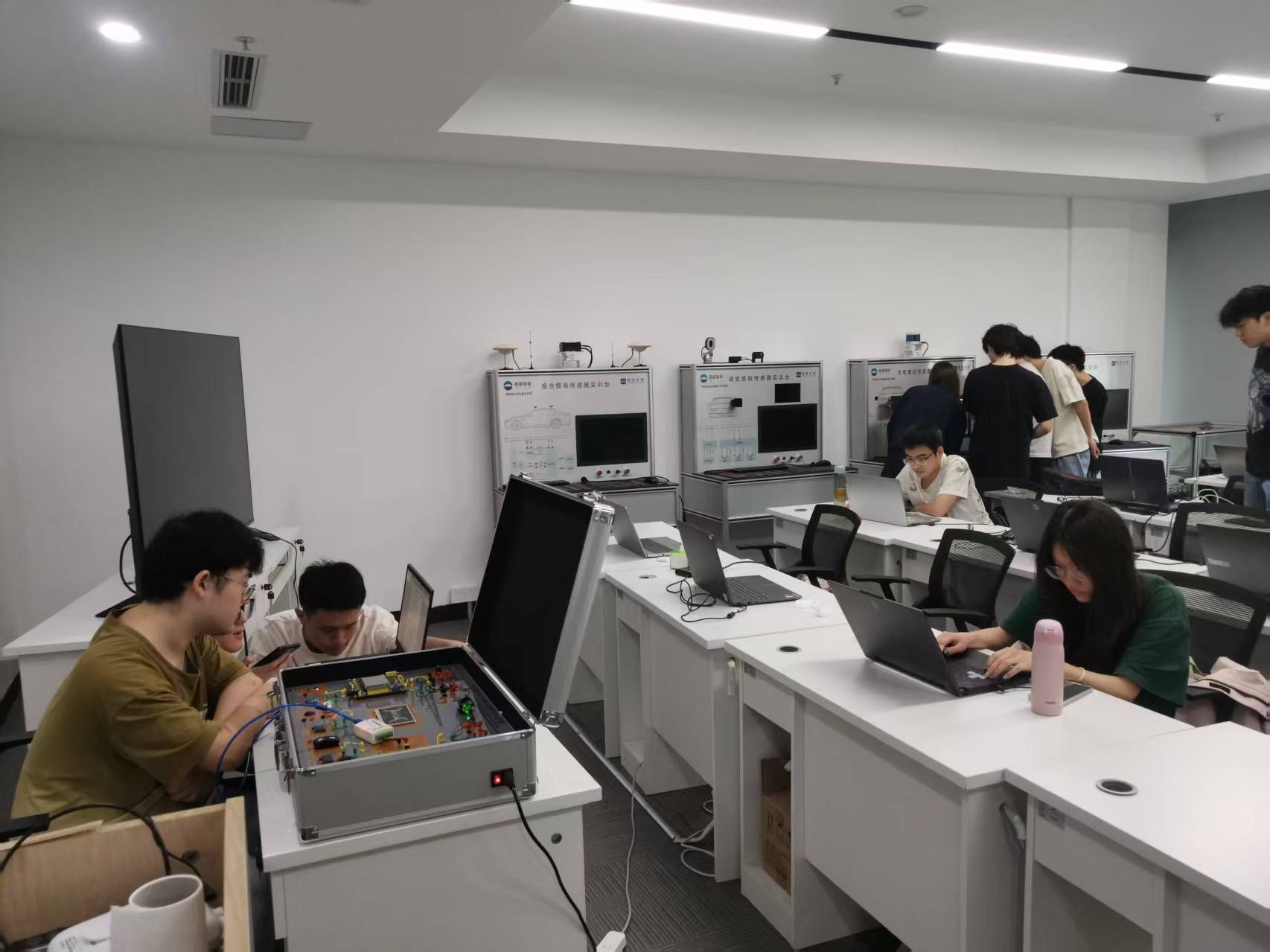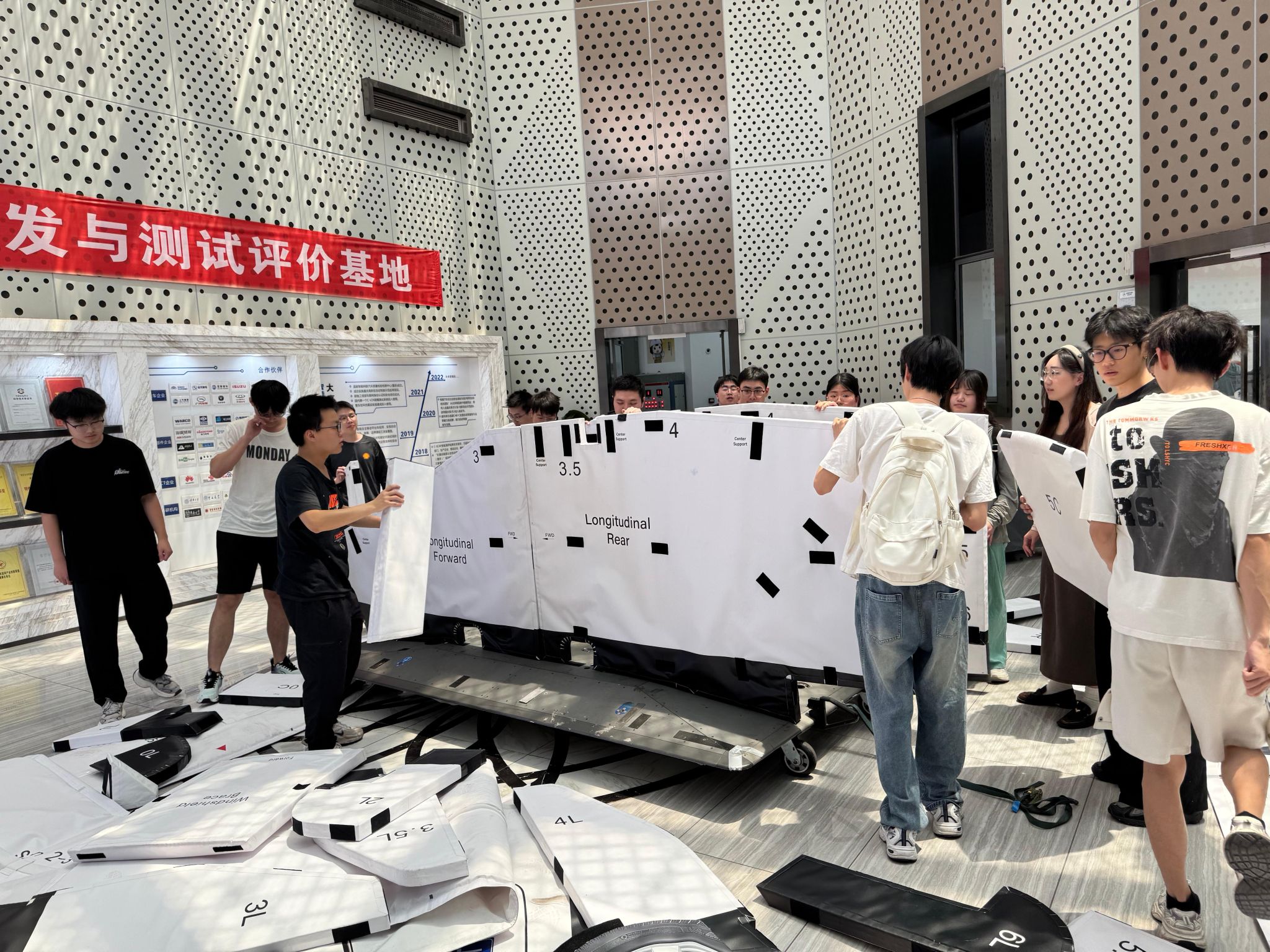 在招商车研金凤基地,同学们先后参观了碰撞大厅和试验场地,并亲自动手组装了GST假车、调试配置了V2X测试设备。工程师们通过现场演示与理论讲解等方式,向员工讲解了智能座舱人机交互试验、驾驶员状态监测试验、车载以太网试验、电磁兼容试验、车载紧急呼叫系统试验等各种测试试验的原理和具体操作实施方法。