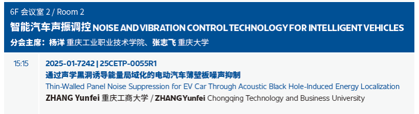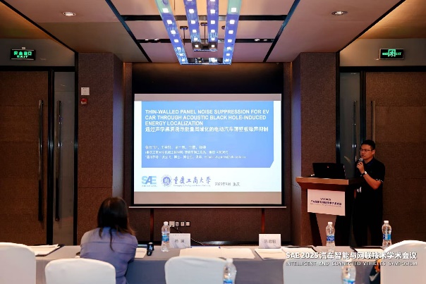 张云飞博士在“智能汽车声振调控”论坛上作了主题为“Thin-Walled Panel Noise Suppression for EV Car Through Acoustic Black Hole-Induced Energy Localization(通过声学黑洞诱导能量局域化的电动汽车薄壁板噪声抑制)”的报告。报告聚焦电动汽车噪声控制核心技术,展现了公司在智能车辆工程领域的研究实力与创新成果,赢得了参会者的广泛关注。借此大会搭建的高端交流平台,张云飞博士同步向现场专家学者介绍了重庆工商大学智能车辆工程专业的历史沿革、学科定位、团队情况与特色优势,进一步扩大了专业的行业影响力。此外,张博士还与参会嘉宾就报告中的技术细节、应用场景及未来研究方向展开深入探讨,为后续学术合作埋下伏笔。