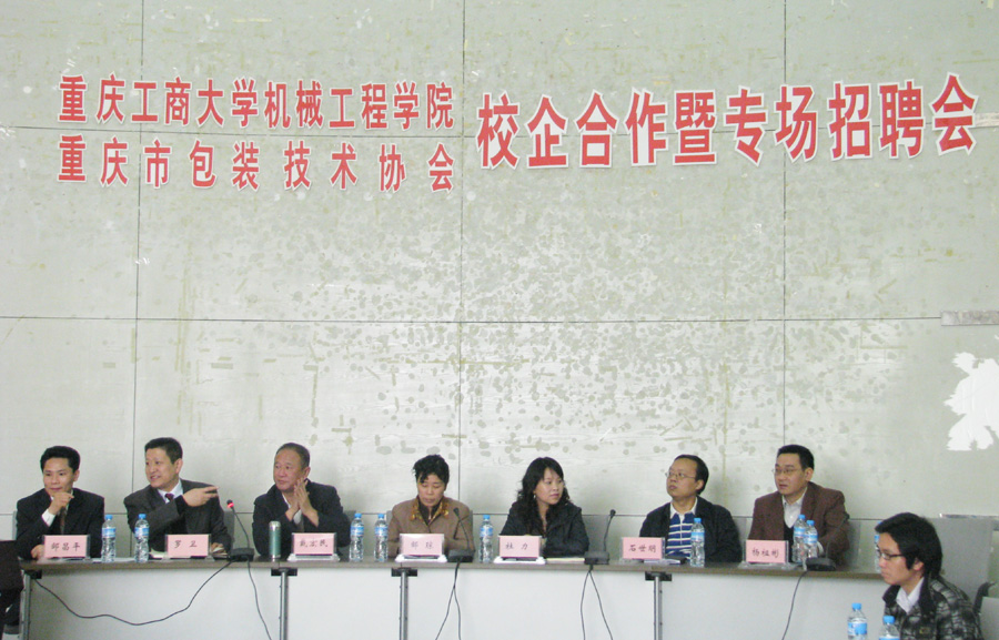 4月19日上午,机械公司联合重庆包装技术协会(下称重庆包协)在启智楼多功能厅举办了校企合作暨包装行业专场招聘会。中国包装联合会科学技术委员会主任、中国包装教育委员会副主任戴宏民教授、重庆包协秘书长邹琼、人才招聘处石世明处长、机械公司罗卫书记、杜力经理、杨祖彬、邹昌平副经理等领导出席了本次专场招聘会。