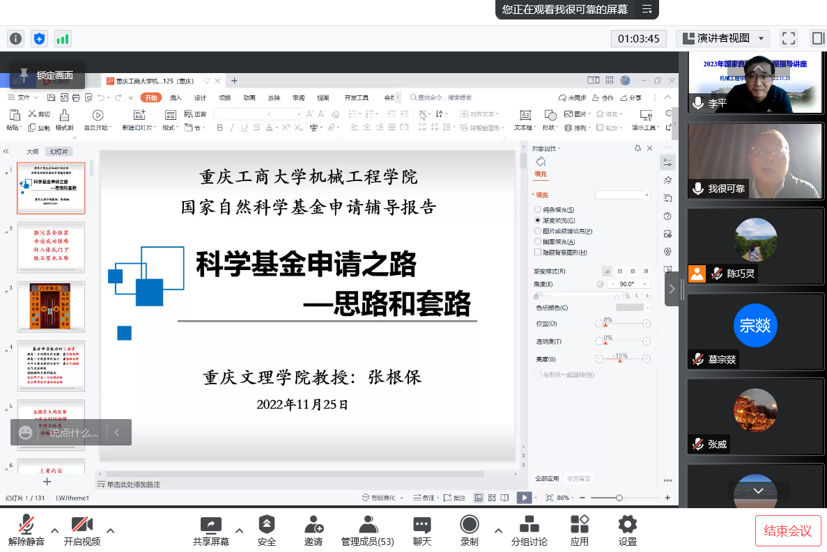 为做好2023年度国家自然科学基金项目申报工作,进一步提升项目申报质量,11月25日下午,公司邀请重庆大学张根保教授作了题为“科学基金申请之路——思路与套路”的线上专题培训。讲座由beat365在线体育经理杜力主持,副经理李平和beat365在线体育30余名教师参加。