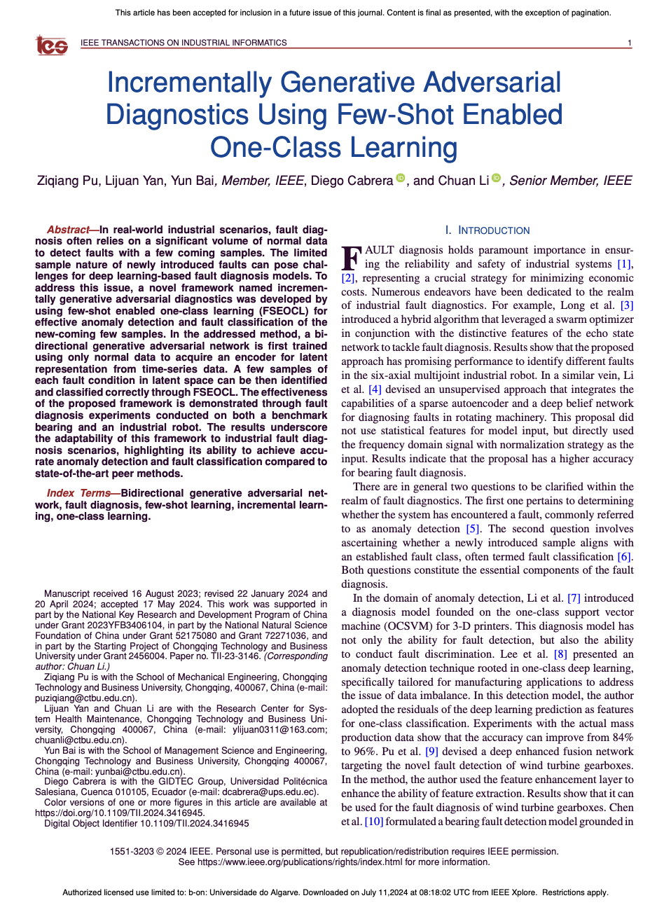 近期,beat365在线体育青年教师蒲自强博士在国际工业信息领域顶级期刊IEEE Transactions on Industrial Informatics上发表了题为“Incrementally Generative adversarial diagnostic using few-shot enabled one-class learning”(使用少量样本赋能的单类学习进行增量式生成对抗性诊断)的学术论文(10.1109/TII.2024.3416945),在工业机械智能故障诊断领域取得了突破性进展。