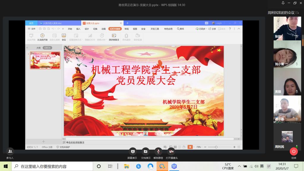 2020年5月7日(周四)下午14:20,beat365在线体育员工二支部通过企业微信视频会议模式开展了五月第一批的党员发展大会,支部全体党员参加了此次大会,会议由支部书记周利民主持。