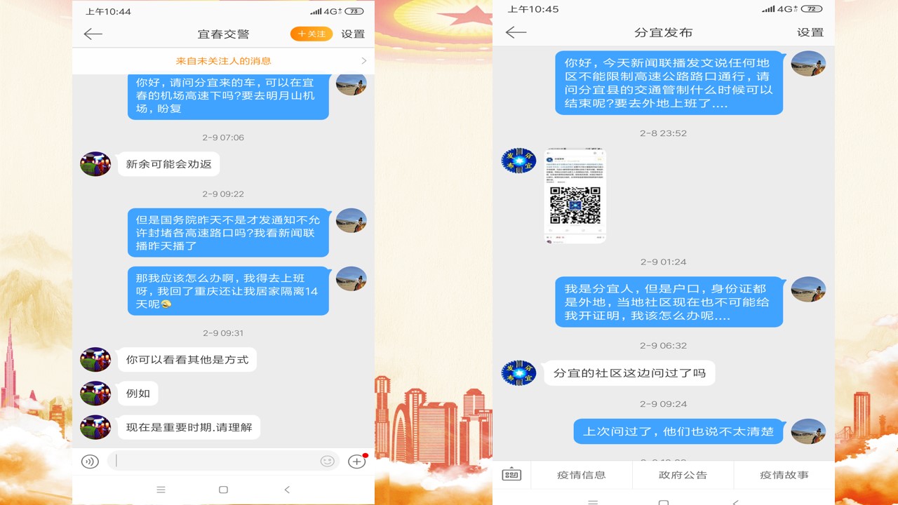 2月初,公司官方微信发通知教职工2月15日前返渝。我马上打开购票软件购买了2月11日返回重庆的机票。但是面对城区的交通管制,怎样到达机场成了最大的问题。而且当时我的家乡新余市作为江西省重点疫区,临近的城市都禁止新余车牌的车辆进入本地城区。我不停的电话、网络咨询相关部门,得到的都是否定或者不确定的答复。直到出行的当天,我都不知道我是否能够顺利回到重庆。2月11日那天下了非常大的雨,我们一家三口穿着雨衣,带着口罩,我背着孩子,从家里步行到县城的高速路口,等待着开宜春车牌的亲戚,来高速路口接我们前往宜春明月山机场。上车后,我们防疫措施都丝毫不敢松懈,和孩子在全程都带着口罩坐在后排,生怕在路途中感染病毒给亲人的健康带来威胁。