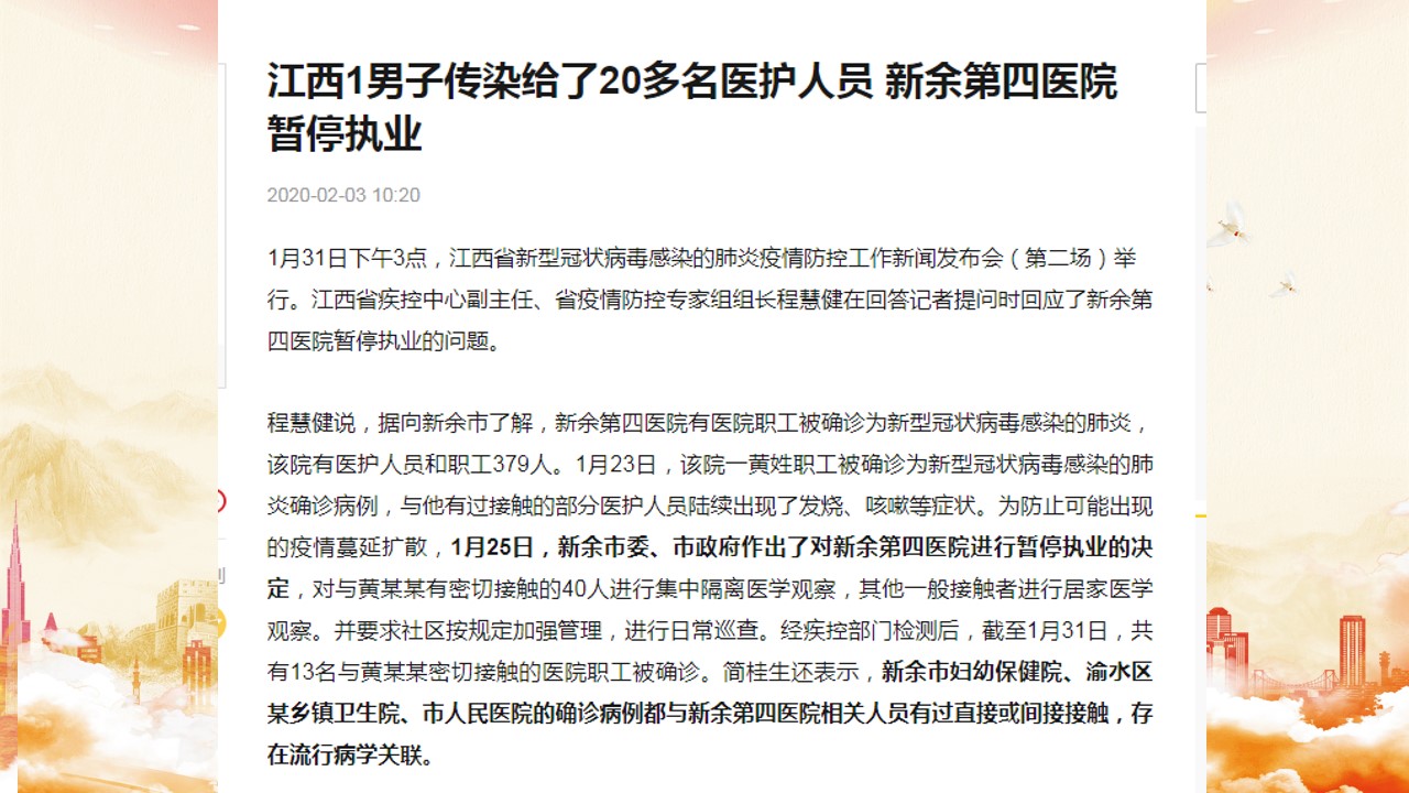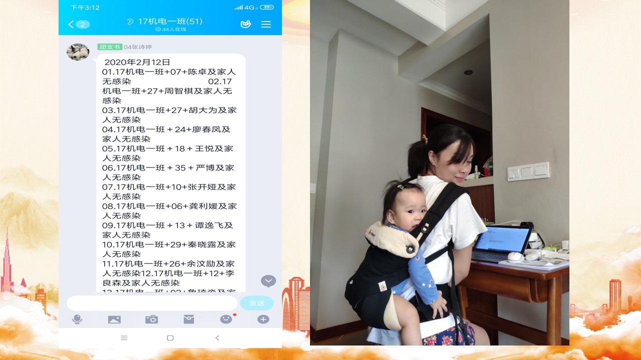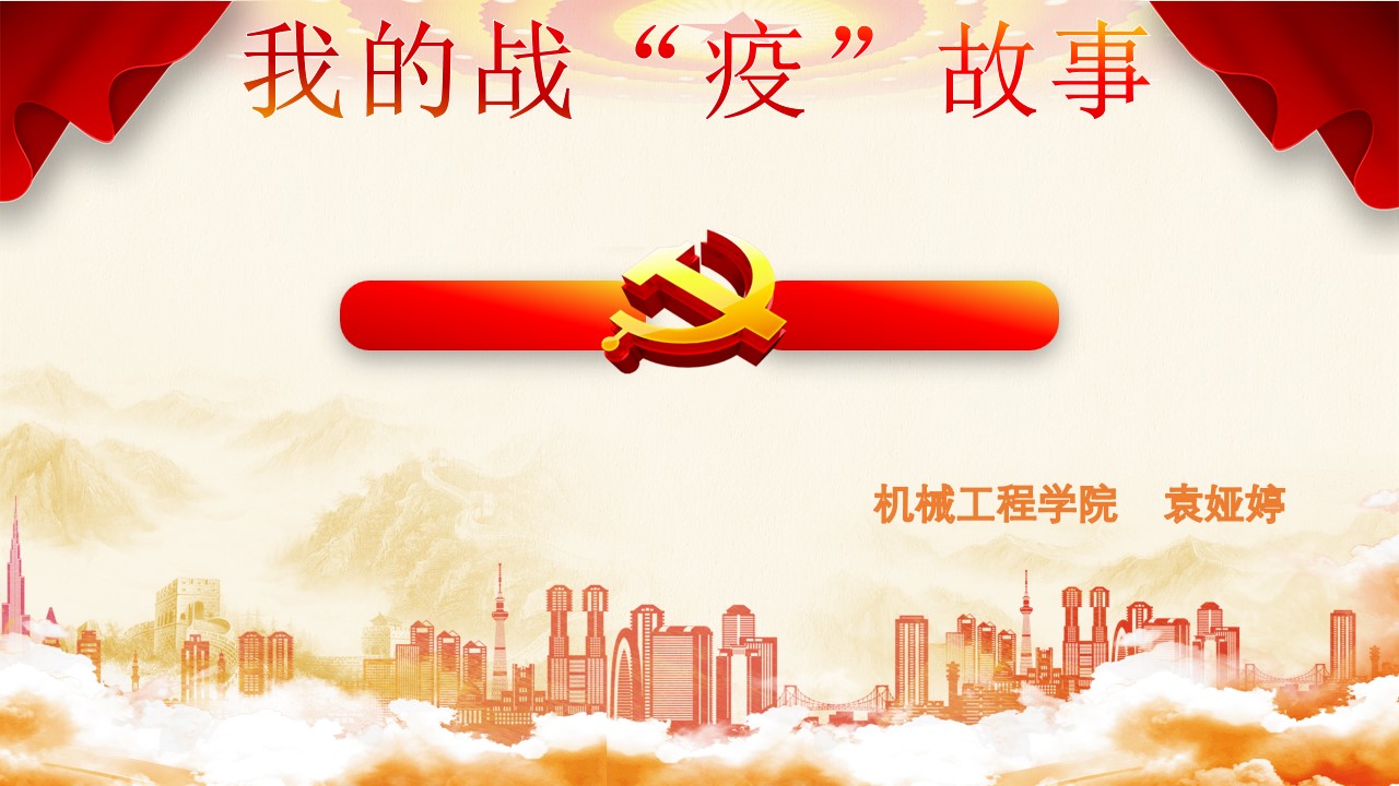 各位老师大家好,我是袁娅婷,一名普通的辅导员,很荣幸在这里给大家分享我的战役故事。今年年初突发的新冠疫情,对于每一个人来说,都是挑战。疫情初期,每天刷新的感染人数、未知的病毒及感染途径,使得产后几个月的我陷入的深深的焦虑。由于身在江西新余老家,1月底新余市医院发生20多名医护感染,使得城市气氛变得尤为紧张。小区封闭管理、高速路口禁止下道、城区交通灯红灯常亮,好像整个城市都按下了暂停。虽然身处新年假期,但家中每一个人的工作却丝毫都未停歇。
