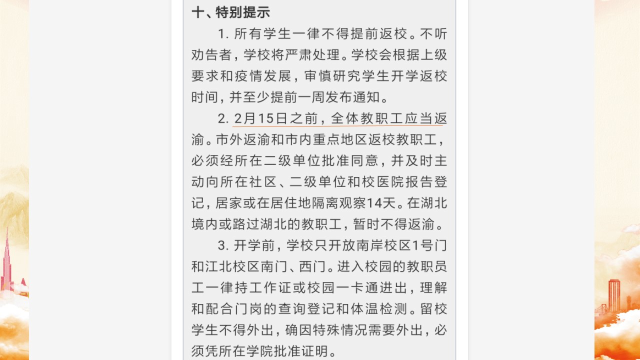 这场战役还在继续,我们的防疫工作也还在继续。我想我们能做的就是积极配合国家的防疫工作,坚守好自身的岗位职责,虽不在抗疫一线,但也身在抗疫后方。相信这场战役对在场的每一位同志都是人生中特殊的经历,幸运的是此时的我们还能健康的在岗位上为社会奉献出自己的力量。这就是我作为一名母亲,一名辅导员,一名中共党员平凡的故事,但因为有我的孩子,我的员工,有那么多在战役中舍身为人的党员同志,使得身处不同的身份的我,所有付出都有了意义。希望社会早日回归正常秩序,希望宁静的校园早日恢复勃勃生机。感谢大家的聆听,谢谢。