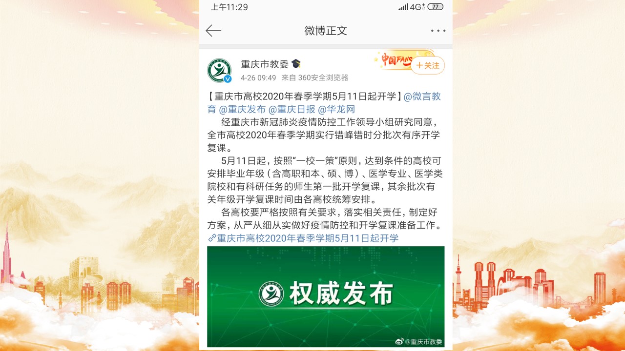 回到重庆后,虽然校历并未开学,但是工作的内容逐渐多了起来。统计与更新员工的居住地址、教委疫情系统的每日上报,答复员工各种关于开学的疑虑,以及部分问题员工由于居家时间太久,亲子关系已经出现了严重的问题,需要辅导员进行心理疏导与转介心理咨询中心。就在各种琐碎的工作进行中,4月底市教委终于发布了返校通知。在传达公司分批返校政策的同时,作为辅导员,需要不停的给同学们宣传防疫知识,关注员工的返校路线,避开重点疫区,将公司的实时更新的各项政策以同学们能够接受的方式传达给员工。在4月27日,我迎来了首批湖北返校的员工。同学们都很配合的遵守公司关于湖北的健康管理政策,每日通过企业微信与我沟通自己的身体状况,我也通过聊天侧面每天了解同学们的心理状态,确保同学们的身心健康。我不禁感叹,在这场战役中,每一位公民都在尽自己的责任与力量配合防疫工作,帮助社会回归正常的秩序。