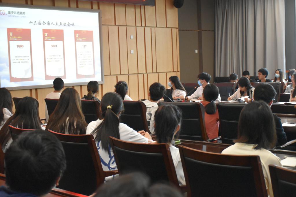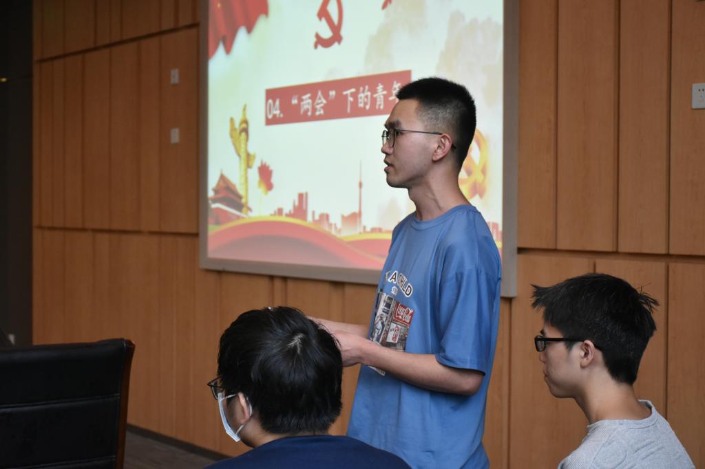 随后,员工党员曹鹏同学开启了“员工党员讲党课”的第一讲,曹鹏同学从“两会”基本知识、重要讲话精神等方面带领全体党员和入党积极分子开展学习宣讲。同学们还以“两会”背景下的青年为主题,畅谈了自己的学习体会。