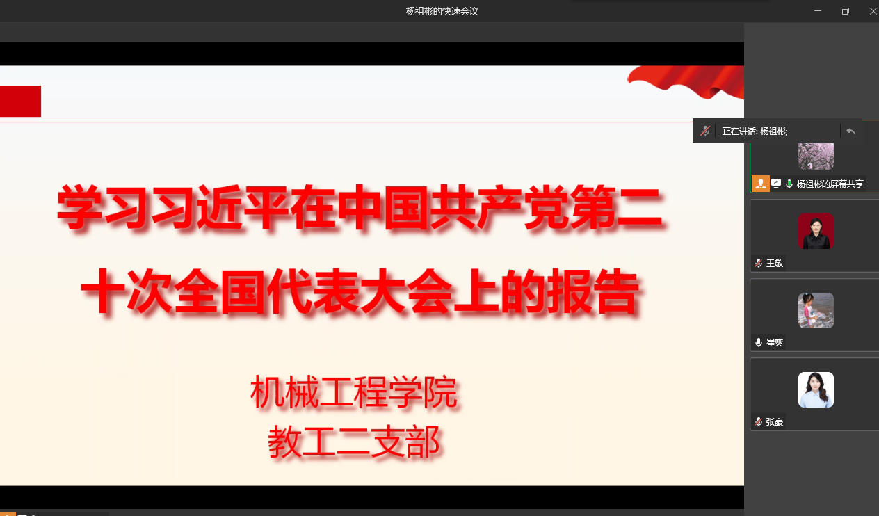 2022年11月4日,beat365在线体育教工第二党支部在慧智楼90708会议室召开了支部会议,专题学习党的二十大报告。本次会议采用线上线下相结合的方式,会议现场由支部党员、公司副经理杨祖彬同志主持,支部全体党员参加学习。