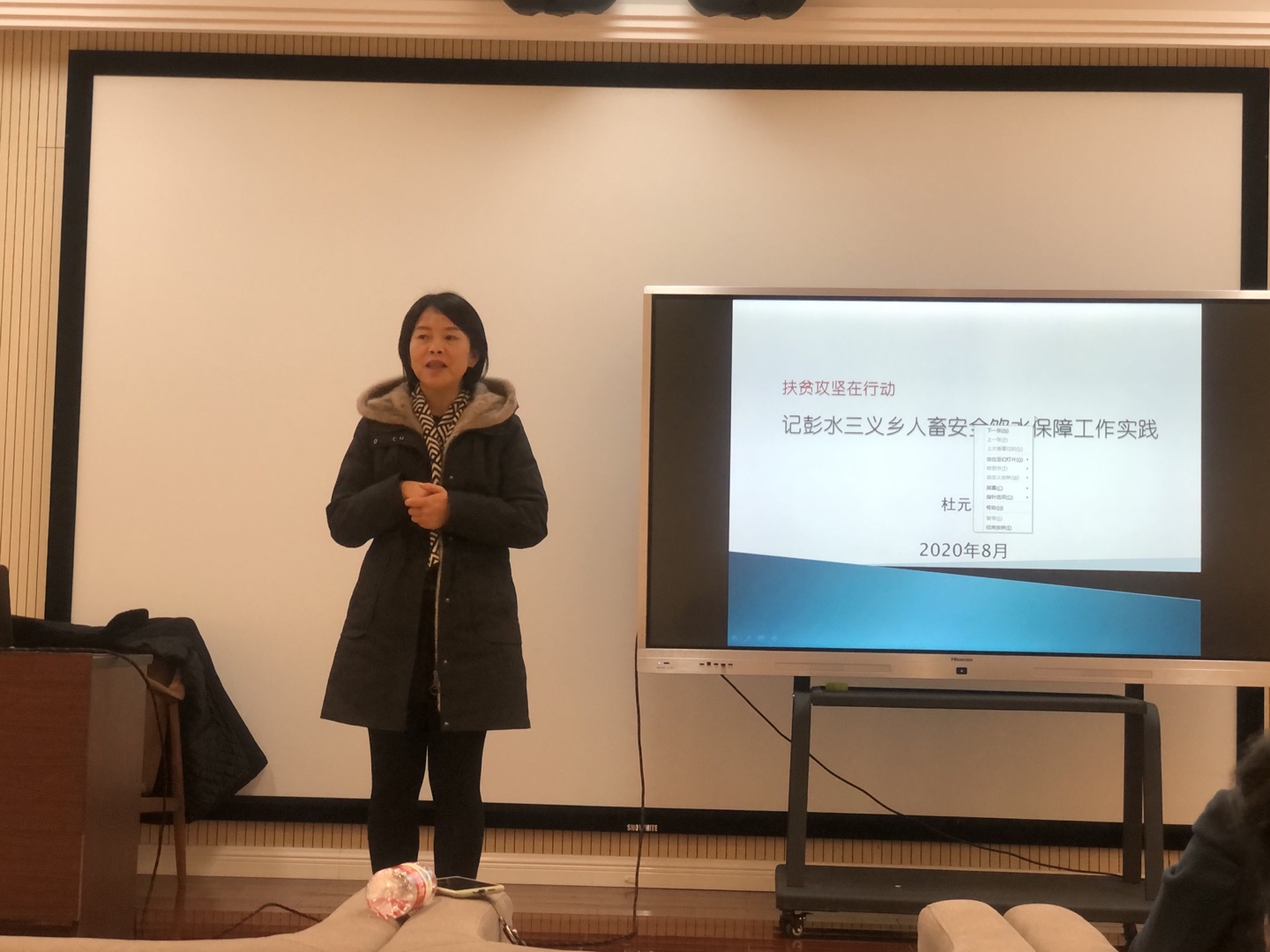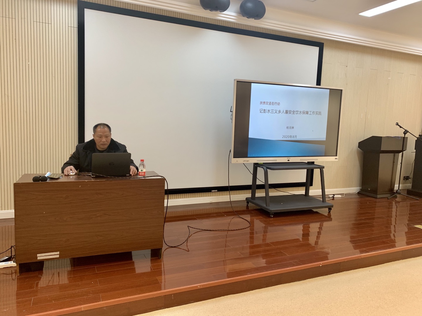 活动第二项议程,邀请后勤处副处长杜元林作彭水三义乡扶贫工作分享。杜元林副处长讲述了他本人到彭水三义乡开展扶贫工作以来,为保障三义乡人畜安全用水所做的各项努力,以及在扶贫工作中自己的收获和感触,言辞恳切,真情流露,得到了观众的一致掌声。他谈到,在彭水县三义乡的扶贫工作,得到了公司的大力支持和关心关爱,工作成绩的取得是因为有公司的坚强的后盾及全校教职工的支持。他表示,作为重庆工商大学的一名党员干部,为公司的发展而努力工作是他的坚定信念,扶贫攻坚的使命与担当,是他勇敢向前的精神力量。