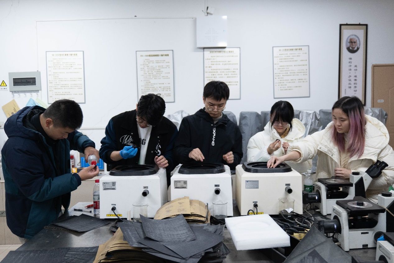 紧接着,选手们将材料送入抛光机进行进一步的细致处理,在整个过程中他们需要细致观察,直至打磨到工件表面无划痕。去腐蚀操作阶段,机器运作的同时,选手们需要及时向机器中添水,直至能够观察到珠光体。这个过程看似简单却精度要求极高,需要选手们精准把控腐蚀时间、液体配比等各个环节,整个比赛中技术难度最大的环节考验着选手们的细心度与观察力。