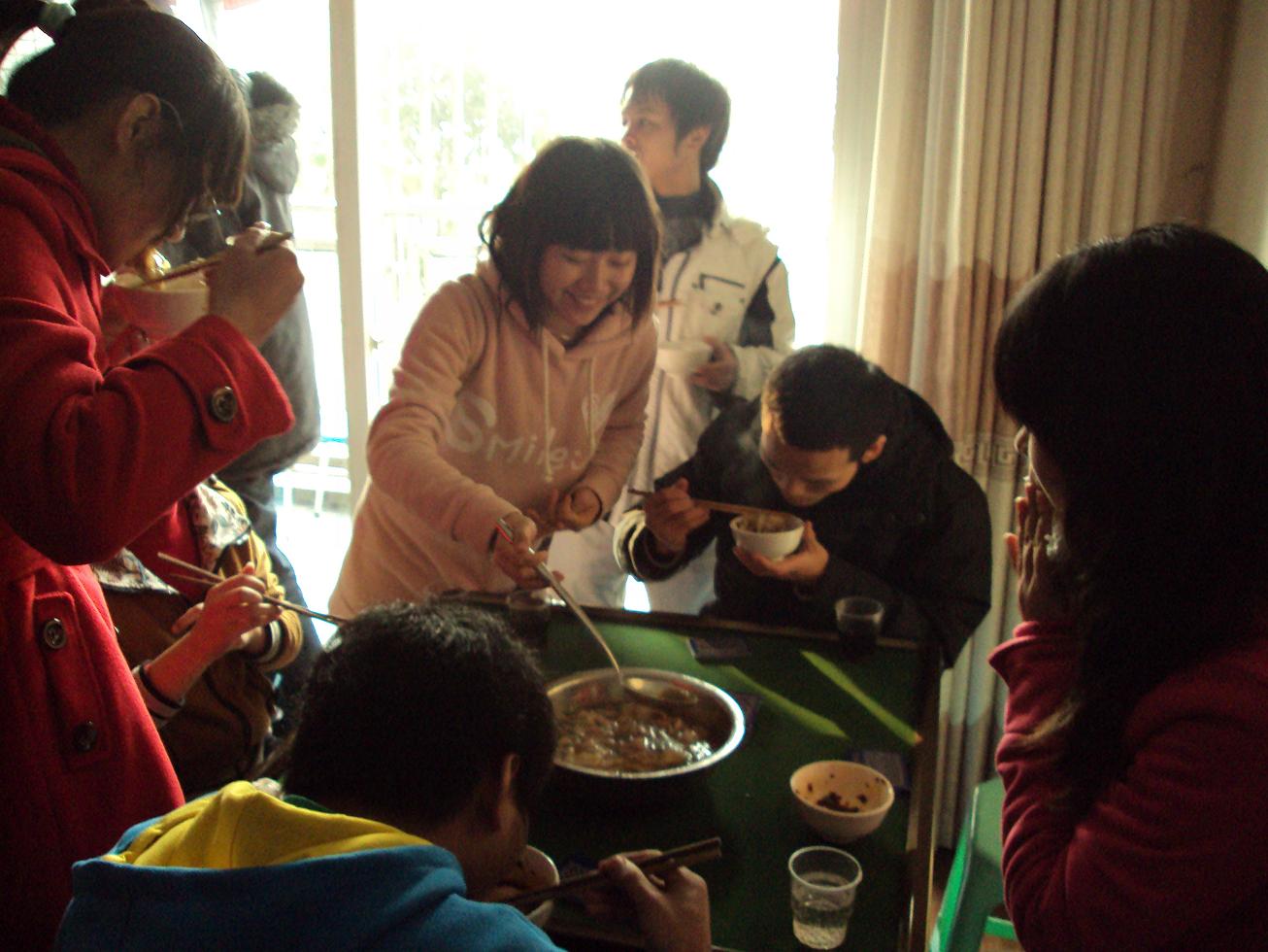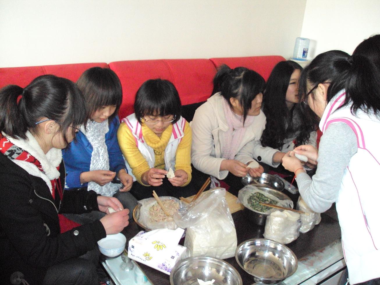 下午三点,大家就来到了日租房。尽管日租房不是很大,条件也不是那么优越,但家的感觉还是迎面袭来。做馅、和面、烧水、切菜、大家七手八脚的忙活起来。大家边做边吃,边吃边做,忙得不亦乐乎。许多北方来的同学纷纷使出看家本领,南方同学也不甘示弱。最后,热腾腾的饺子出炉了,所有人一起高兴的分享了胜利的果实。最后,全体同学跟老师一起玩起了游戏,再一次拉近了同学与老师、同学们之间的距离,增进了大家的感情。