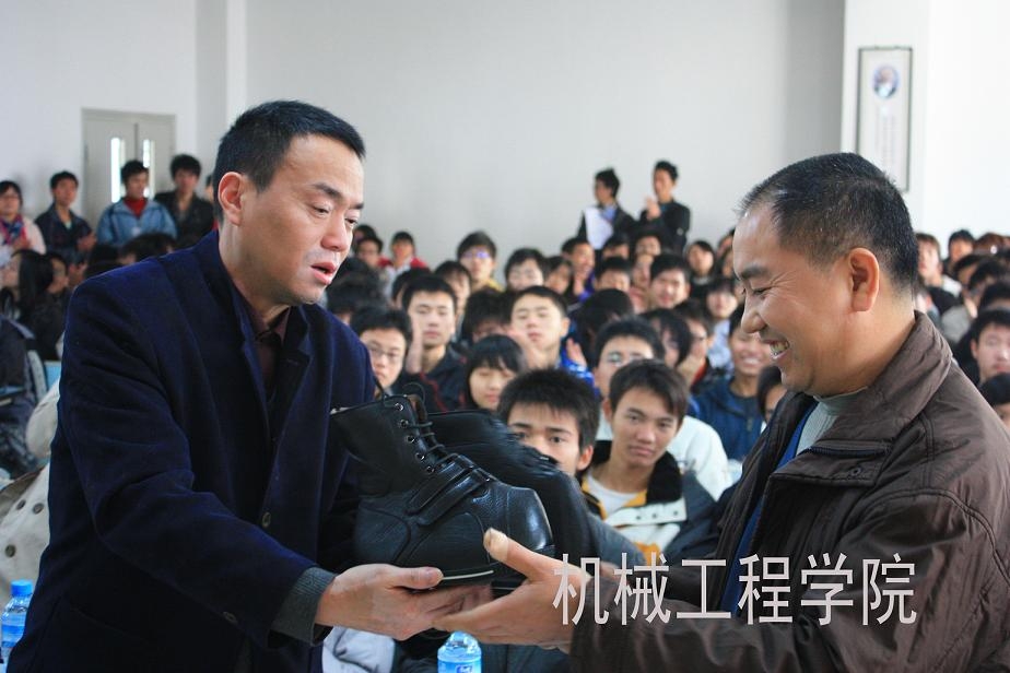 beat365在线体育团总支员工会通过重庆电视台“天天630”节目得知一位足部残疾的彭先生四十几年都没有一双真正的鞋子的时候,主动联系重庆电视台,经过多方寻找和协商终于感动了重庆双菱皮鞋厂,为彭先生制作了一双属于他自己的鞋。11月23日中午12:30,在公司兰花湖校区20307教室,彭先生终于收到了这份特别的礼物,并用自己所见所感为在座的所有人上了一堂生动的思想教育课。活动现场,不仅有感人的话语,动人的故事;更多的是我们看到了残疾人那种自强不息,向美好的生活迈进的坚定信念和社会对于残疾人这类弱势群体的关爱之情。beat365在线体育团总支书记刘静老师指出要同学们将这种关爱之心延续下去;重庆双菱集团的杨总也提到:没有打不倒的困难,只要我们有毅力,有决心!重庆电视台“天天630”节目也对此次活动进行了全程报道。