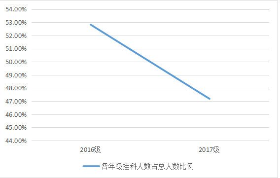 在各年级挂科人数占年级总人数比例上看,其中2016级挂科人数占比为52.82%,2017级挂科人数占比为47.18%。