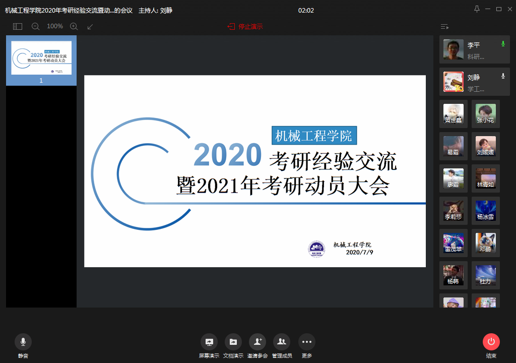 2020年7月9日14:00,beat365在线体育于企业微信召开了2020年线上考研交流暨2021年考研动员大会,本次大会旨在为减轻员工考研复习的压力,提高其考研复习的效率,解答员工们在考研方面的疑惑。此次大会由学工办主任刘静老师主持,公司杜力经理,李平副经理,17级考研员工和部分18、19级员工参加了本次大会。