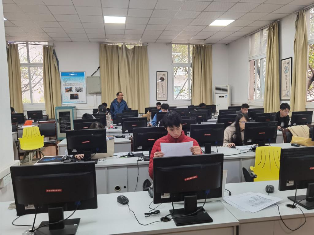 11月21日进行的是大一组比赛。大一组的比赛分为尺规绘图和CAD成图,共有179位同学参加。当天上午9:30到10:30,11:00到12:00两个时间段在重庆工商大学兰花胡片区广智楼20706、20707、20708三间教室进行了尺规绘图。下午13:30,在重庆工商大学南岸校区工程训练中心三楼的机房和绘图教室进行了CAD成图,最后大一组的比赛在下午14:30正式结束。