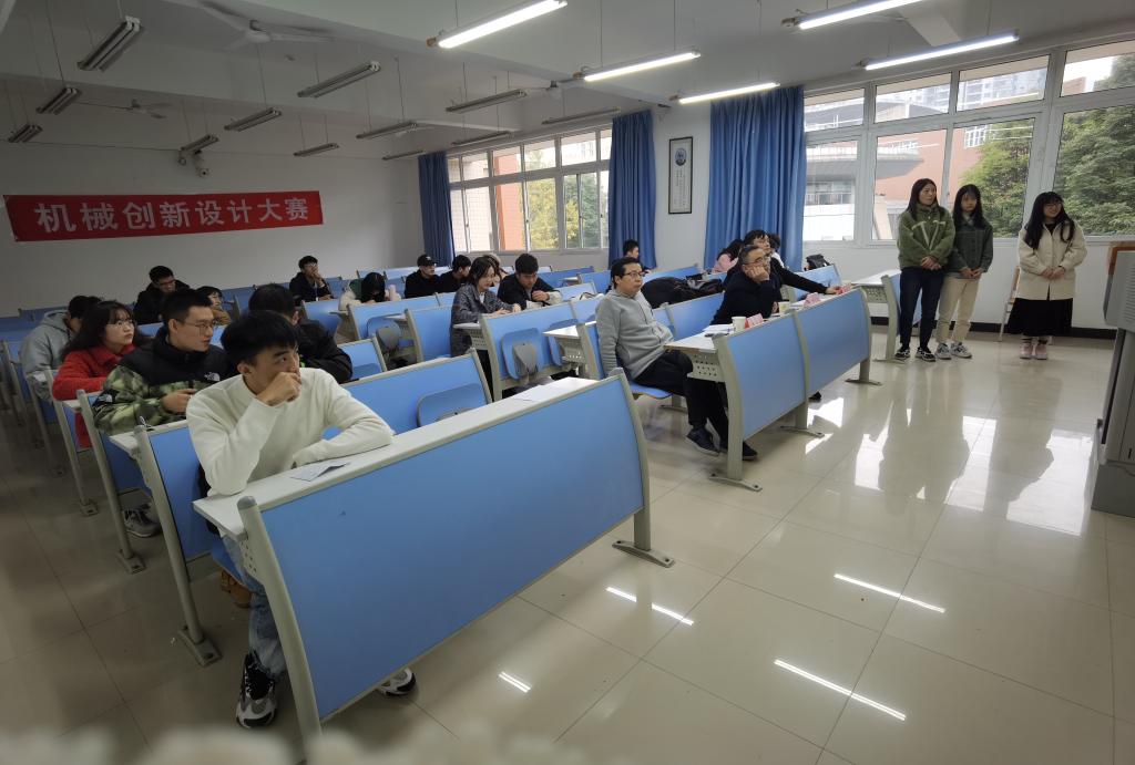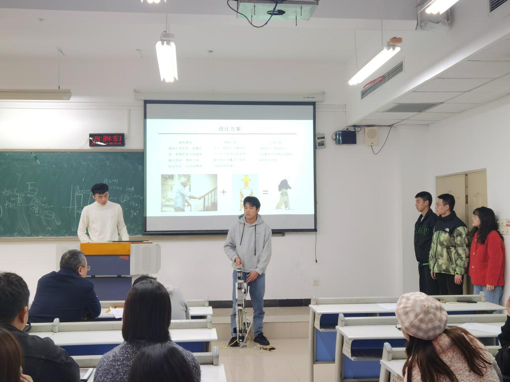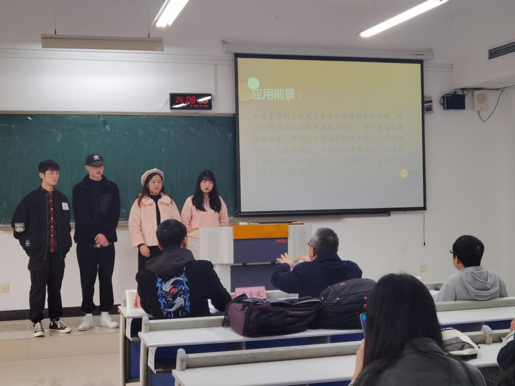 本次比赛的决赛共有六组同学成功晋级,评委黄勇刚老师简要为参赛者们讲解了比赛流程与细则,并宣布比赛正式开始。展示过程由各个成员团结协作共同完成,每个小组派出一名主要讲解员,依次上台借助PPT、三维建模以及实物展示等多种方式展示自己的设计作品。评委老师们在展示完成后对参赛小组进行提问,从多面角度对他们的作品给予改良建议和鼓励。全部小组展示和答辩完成后,评委老师们再根据小组作品以及答辩的完成情况给出最终评分并进行排名。在此次比赛中涌现出了各种各样创意十足的作品,如餐具自动回收机,便捷式坐便器,自动捡球机等等。这些源自生活的设计作品,充分地体现出锻炼员工实践动手和科技创新能力的比赛目的。
