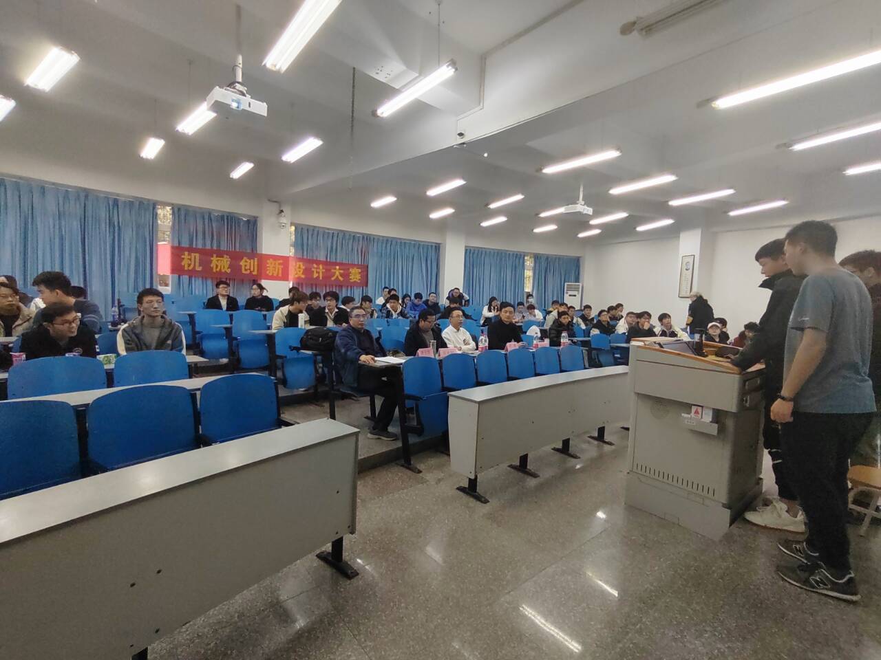 在比赛过程中,各组选手分别上台介绍团队的作品,阐述设计理念,评委老师实时提出分析和建议,并鼓励在场的所有参赛者共同分析、一起参与。此次参赛作品种类繁多,创意新颖,得到了评委老师的高度认可,其中突出的有仿生机械、环境保护治理机械等。全部小组展示答辩完毕后,评委老师根据各小组情况完成最终评分及排名。