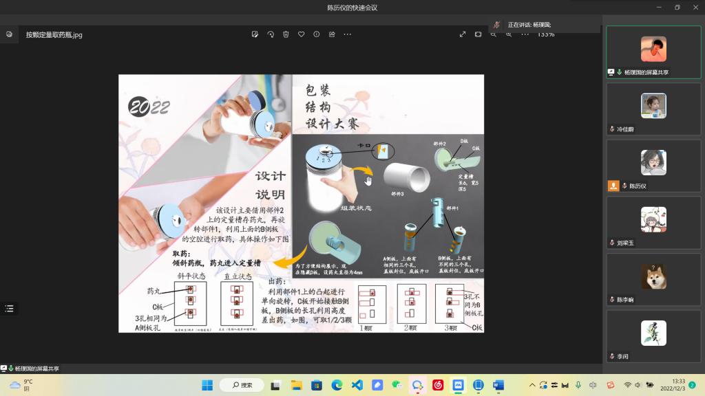此次比赛先由每组指定一位同学为代表对作品进行介绍。然后在评委老师的提问下进行答辩。在此次比赛的答辩过程中,各组代表分别对作品进行介绍,阐述小组的设计结构。本次参赛作品内容包括开瓶器、定量药瓶、零食包装、糖果礼盒等,同学们的作品涉及日常生活中的各个方面,结构样式新颖,创新性极强。评委老师们也每个小组作品一一提出问题,对同学们的作品做出点评并提出改进的地方。