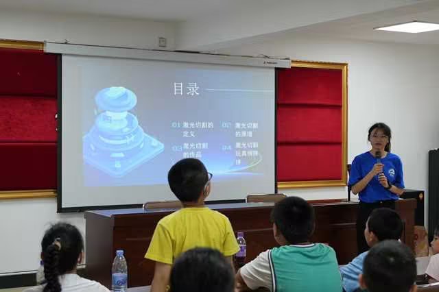 激光切割课堂上,宣讲团成员用通俗易懂的语言为社区青少年讲解激光切割原理,针对什么是激光切割,怎么切割等专业问题展开详细介绍,再通过实物作品、视频等展示操作,进一步激发青少年学习兴趣。随后,宣讲团成员与青少年相互协作,完成木板拼图拼装,进一步锻炼青少年动手能力,培养青少年合作意识。课程结束后,青少年朋友们意犹未尽,迫不及待进入第二节课堂。智能机器人课堂上,宣讲团用定义引出课堂主角——NAO机器人,通过视频结合图片讲解,帮助青少年快速了解NAO机器人相关功能,感受科技的乐趣与神奇。
