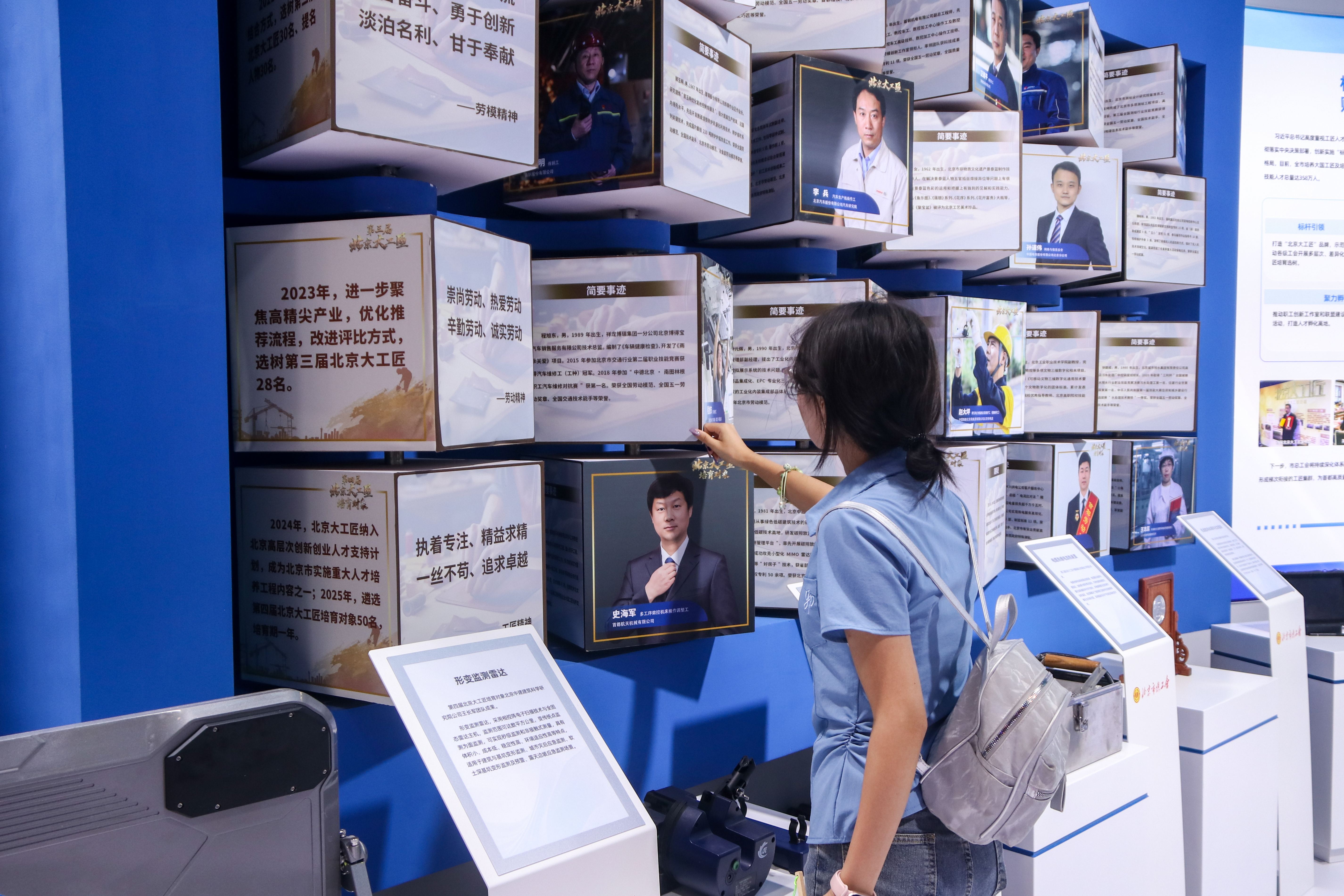 本次交流大会展示了来自全国各地各行业大国工匠、劳模代表的顶尖创新成果和精湛技艺。在工作室老师的带领和讲解下,同学们沉浸于科技与匠心交织的展厅,从精密的智能装备到巧夺天工的工艺作品,从突破“卡脖子”技术的攻坚故事到数十年如一日的专注坚守,每一件展品、每一位工匠都成为最鲜活的教材。同学们时而驻足观摩,时而踊跃提问,在与一线工匠的面对面交流中,深刻感受到了何为“执着专注、精益求精、一丝不苟、追求卓越”的工匠精神内核。