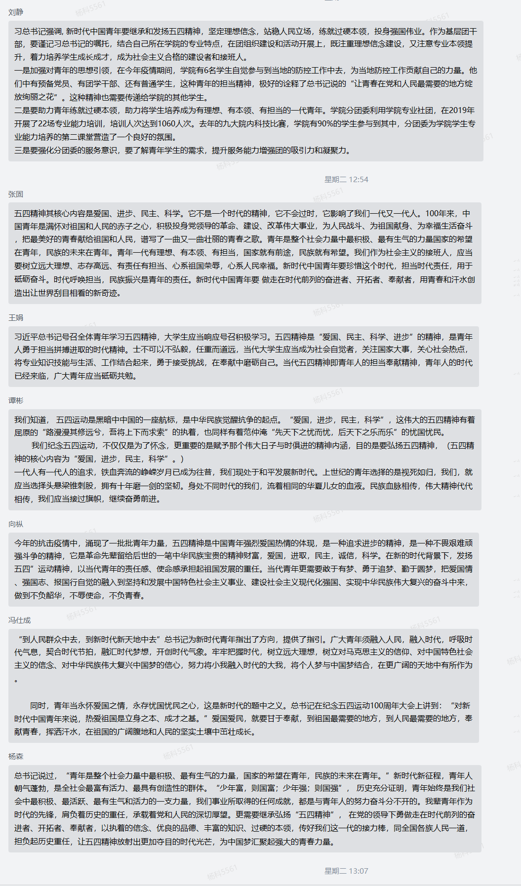 公司各支部积极参与,深入学习贯彻习近平总书记关于疫情防控工作的系列重要讲话和指示批示精神,学习习近平总书记给北京大学援鄂医疗队全体“90后”党员的回信精神,学习习总书记“五四”重要讲话精神。“党旗所指就是团旗所向”,在今年疫情期间,公司有6名员工自觉参与到当地的防控工作中去,为当地防控工作贡献自己的力量。这种青年的担当精神,诠释了习近平总书记说的“让青春在党和人民最需要的地方绽放绚丽之花”。在习近平总书记为核心的党中央坚强领导下,全国人民打赢疫情防控阻击战和稳步推进复工复产的突出成效,激励团员青年不惧风雨、勇挑重担,作为有担当的新时代中国青年,我们应感恩位于防疫工作前线的每一个人。
