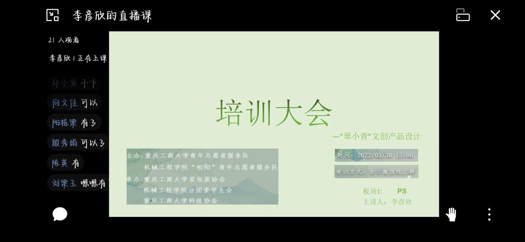 为助力校团委CTBU“翠小青”志愿服务品牌文创产品设计大赛顺利进行,2022年3月20日,公司“初阳”青年志愿者服务队和星包装协会面向全校员工开展PS、C4D软件线上培训活动。此次活动由校青协和“初阳”青年志愿者服务队主办,星包装社团承办。