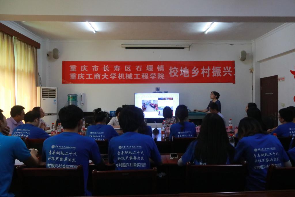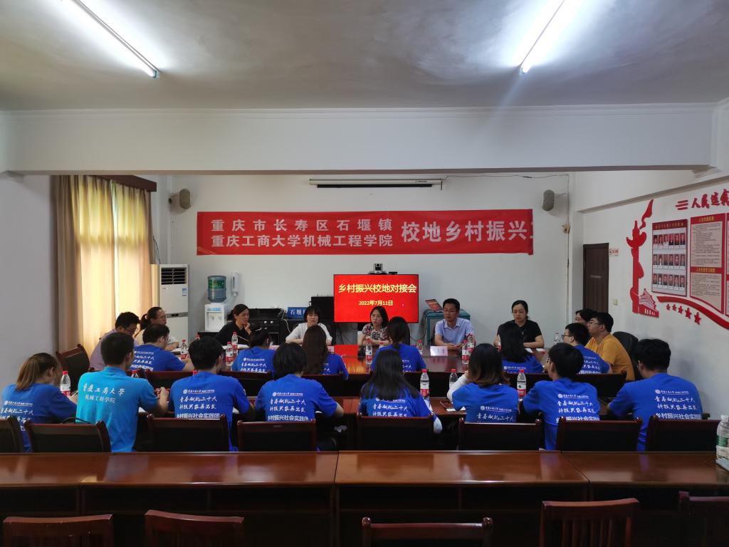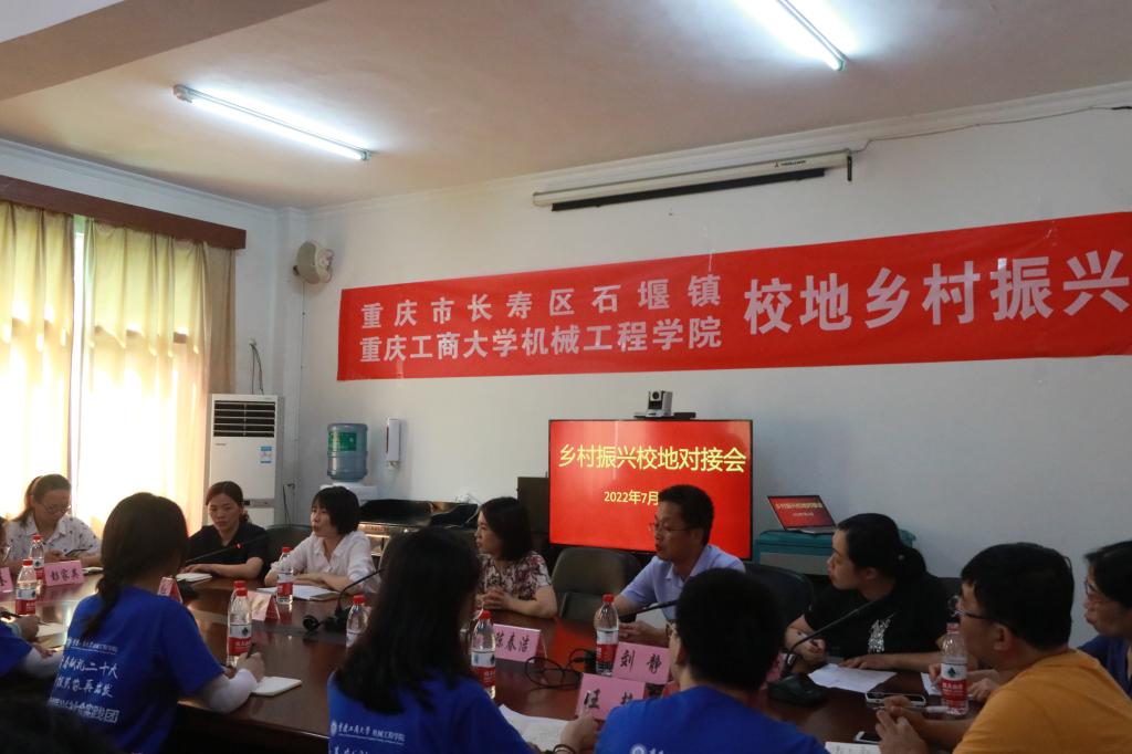 为贯彻落实习近平总书记关于青年工作的重要思想,深入学习习近平总书记在庆祝中国共产主义青年团成立100周年大会上的重要讲话精神,引导青年积极投身于社会实践的“第二课堂”,在社会课堂中“受教育、长才干、作贡献”,坚定信念听党话、跟党走,以实际行动迎接党的二十大胜利召开,2022年7月11日下午,重庆工商大学beat365在线体育和重庆市长寿区石堰镇政府举办校地乡村振兴工作对接会。长寿区石堰镇党委书记唐慧芳、副镇长瞿小红、经发办主任蒋夕奎、产服中心主任彭家英,重庆工商大学机械工程公司党委书记杨娟、党委副书记陈春洁、分团委书记刘静、专业指导教师谢艳平、董峰与社会实践团全体员工参加了此次对接会。