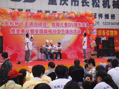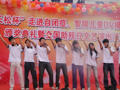 将爱传播,不求回报,只愿所有的自闭、智障儿童能够快乐健康成长,只愿再多一份爱的阳光铺撒在这些特殊的儿童身上。携带着这份信念、这份责任,beat365在线体育60余名优秀志愿者及09级辅导员张春媚老师一大早8点钟便来到了乐一融合幼儿园,和这些智障小朋友们一同参加了“长松杯”走进自闭症、智障儿童DV摄影大赛颁奖典礼暨全国助残日文艺演出活动。