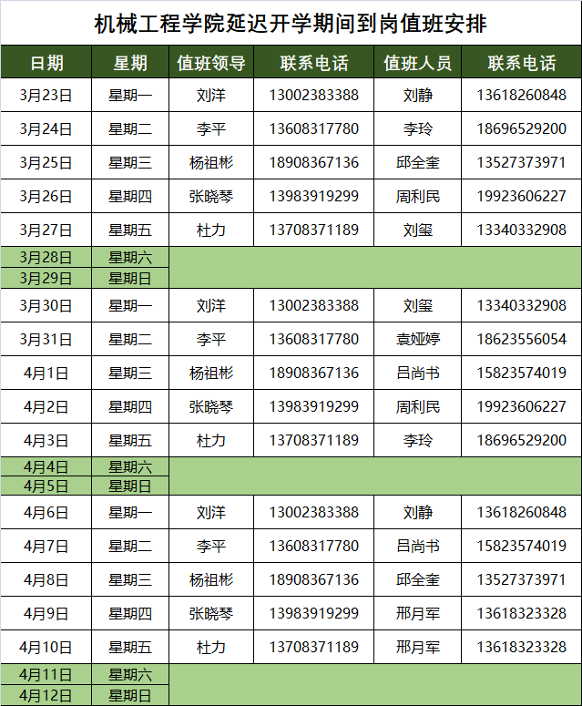 beat365在线体育3.23-4.10延迟开学期间到岗值班安排