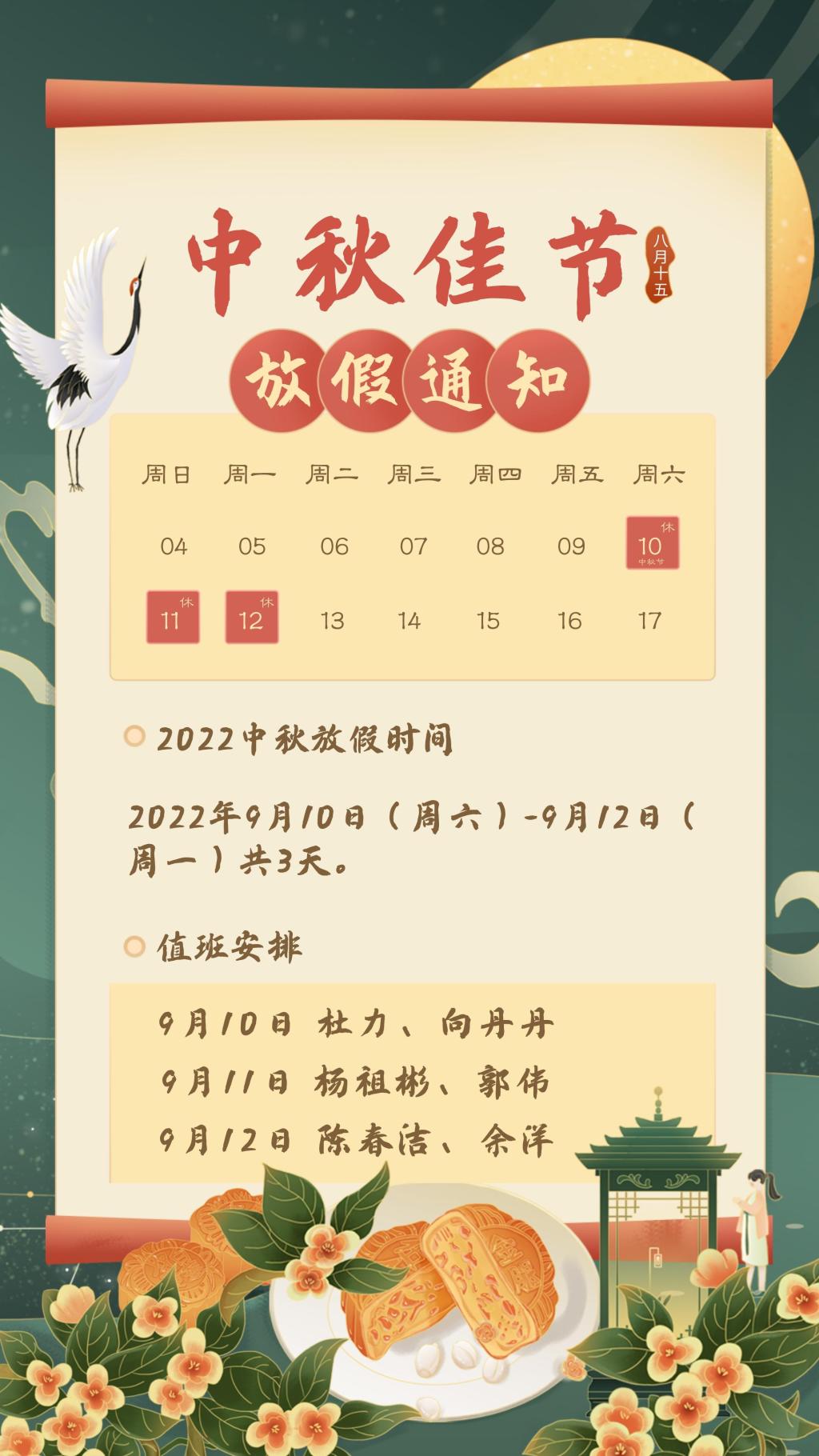 2022年中秋节放假及值班安排