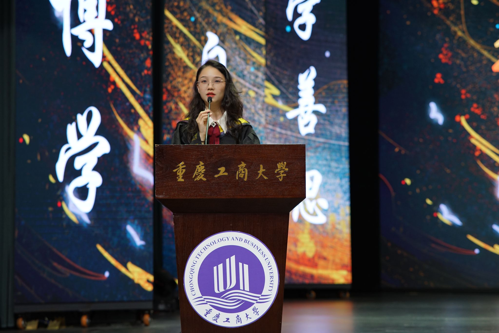 重庆市优秀毕业生、2020级智能制造二班王艳和重庆市优秀毕业研究生、2021级硕士研究生梁鑫鑫,分别作为本科毕业生代表和研究生毕业生代表上台发言。她们深情回顾了大学的学习和生活,表达了对母校、老师和同学们的感激之情和对未来的坚定信心、美好祝愿。她们的话语中充满了对未来的憧憬和对母校的感激之情,仿佛将毕业生们带入了星河的壮丽与山海的广阔之中。