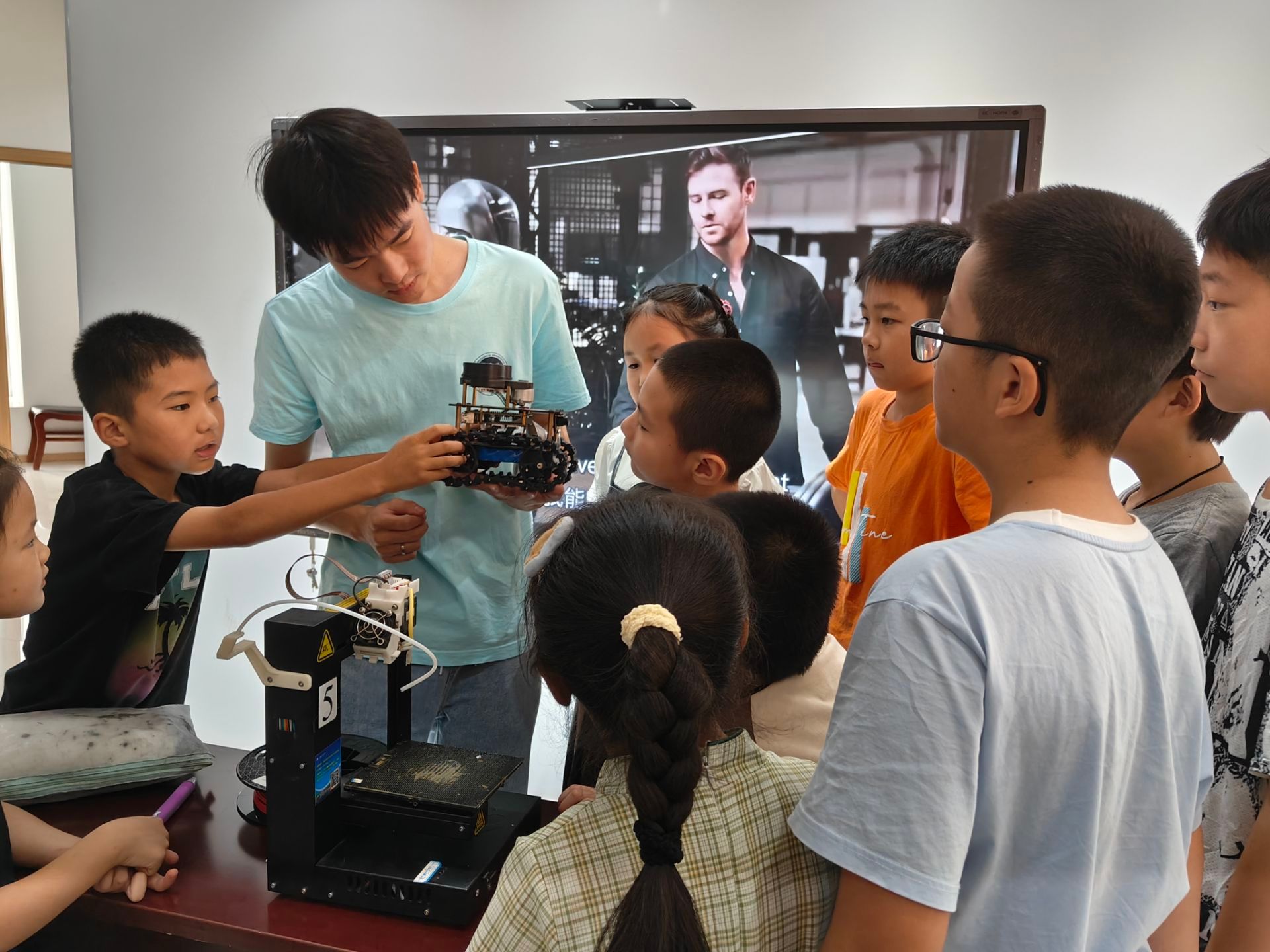 活动中,实践团成员蓝峻先与小朋友互动提出机器人概念,再以智能程度介绍了openai机器人、lio机器人、家用机器人、工业机器人等,每一类机器人都激发着孩子们的好奇心,小朋友们惊叹地表示机器人模仿人类竟有如此的相似度。随后实践团通过视频,展示了智能小车在预设轨道上的精准行驶,现场发出一阵阵惊叹声。为了让青少年们更直观地感受科技的力量,活动还特别设置了动手实践环节,在实践团成员们的指导下,孩子们亲自参与小车的调试与改进,通过实际操作体验了机械与编程的奇妙结合。