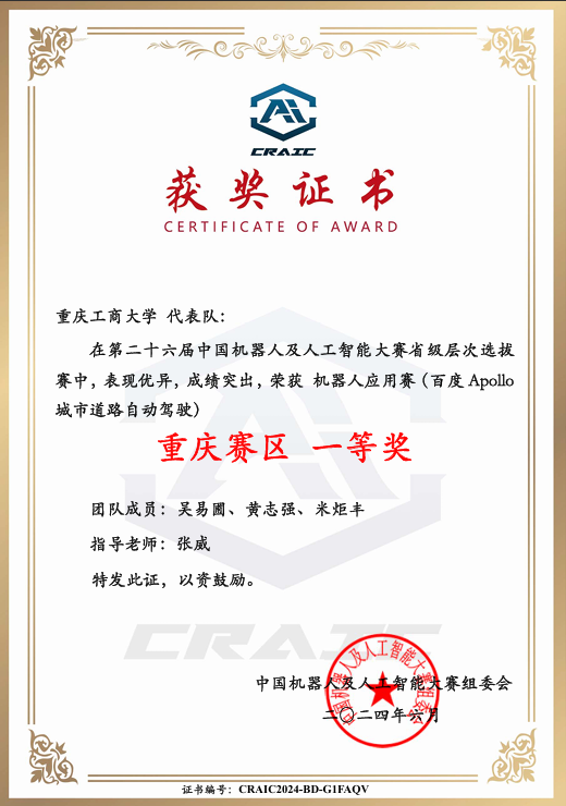 公司beat365在线体育的参赛团队“9961永不妥协”(成员:吴易圃、黄志强、米炬丰,指导老师:张威)在“百度Apollo城市道路自动驾驶”赛项中,继重庆赛区荣获一等奖后,成功晋级全国总决赛,经过一番激烈角逐喜获二等奖。这已是公司连续第三年参与该赛项,且成绩逐年显著提升,体现了公司智能车辆工程专业人才培养模式改革初见成效。