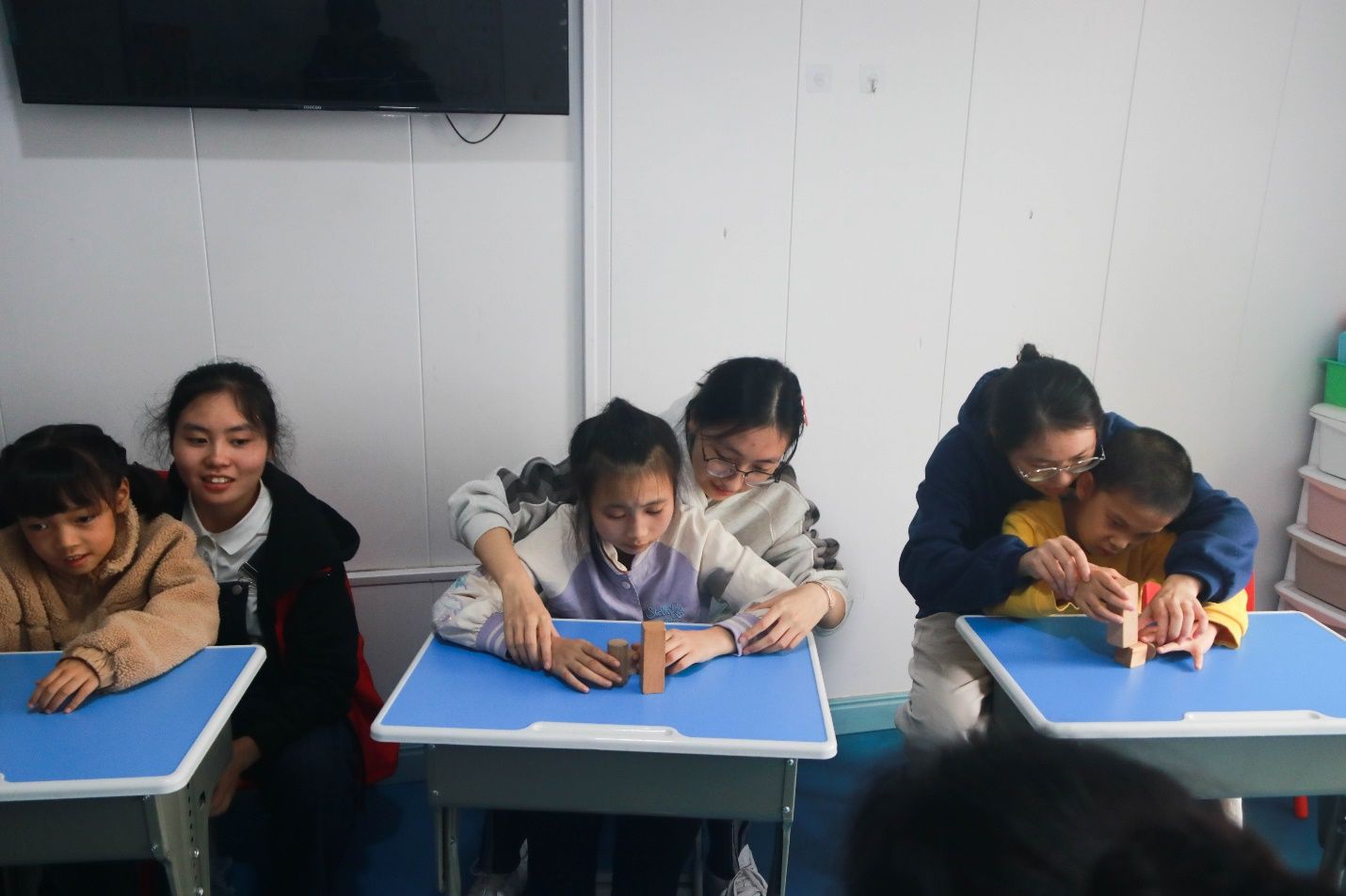 阳光透过云朵洒向大地,温暖着整个世界。志愿者们与孩子们携手开展着丰富多彩的活动,辅导室内,志愿者们细心耐劳的辅导着孩子们的功课;运动训练室中,志愿者们用自己的双手为孩子们挥动着跳绳帮助他们的完成康复训练;同时志愿者们也带领着孩子们开展富有趣味的游戏,教室中积木在孩子们和志愿者们的手上被堆成各种各样的形状;一个个的保龄球在志愿者们的加油声,由孩子们的手上推出,撞倒了的不仅仅是前方的瓶子,更是孩子们前行中的困难。