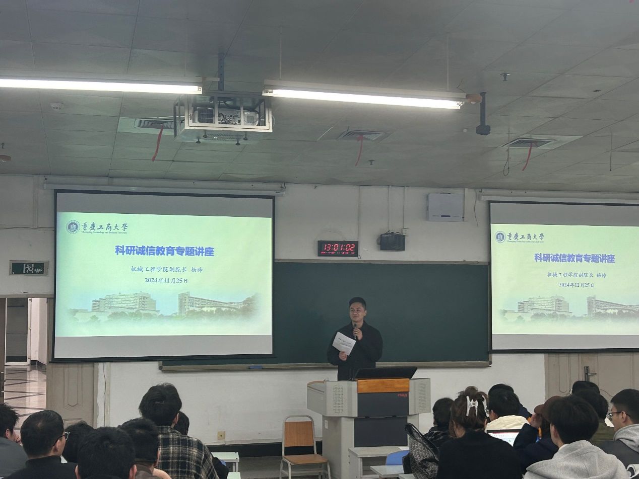 主题班会的第一阶段以“铸就科研之魂,坚守诚信之道”为主题,公司科研副经理杨帅教授为同学们做了诚信科研教育专题讲座,在这个创新驱动发展、科技日新月异的时代,每一份科研成果都承载着推动社会进步与产业升级的重任。 杨帅围绕公司关于学术诚信相关文件在宣讲时指出,在追求科研高峰的道路上,诚信如同一盏明灯,照亮着研究者前行的方向,确保科学探索的每一步都坚实可靠,同时,杨帅通过深度对话和今年在公司评选奖学金中出现的关于论文署名的具体事例等生动案例,为机械专业的研究生们树立正确科研观念,强化诚信科研意识,为未来的科技征途奠定坚实的基础。杨经理详细阐述了诚信科研的重要性,从学术不端的严重后果到诚信科研对个人职业生涯的正面影响,通过一系列真实的科研诚信案例,深入浅出地分析了诚信缺失对科研生态造成的破坏,以及如何在日常研究中坚守诚信原则,避免踏入误区。他强调,作为新时代的机械研究生,不仅要掌握扎实的专业技能,更要培养高尚的科研道德,做到“言必信,行必果”,让每一项研究成果都能经得起时间与实践的检验。