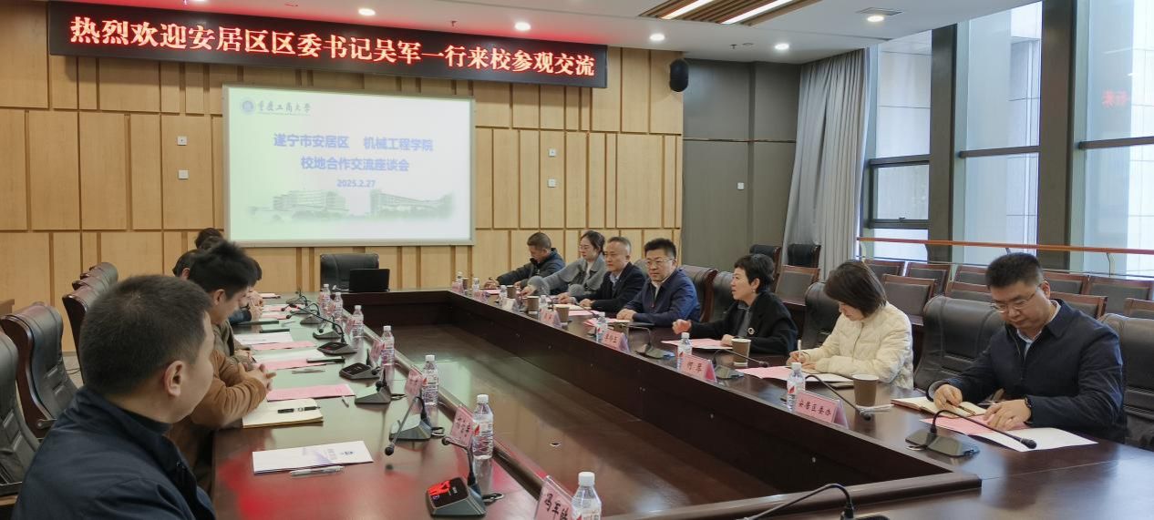2月27日下午,遂宁市安居区委书记吴军,区委常委、组织部部长李玲玉,区政府党组成员、经开区管委会主任向阳一行来院交流校地合作事宜。公司党委书记杨娟,经理李平,副经理杨帅、谢俊等出席座谈会,会议由公司党委书记杨娟主持。