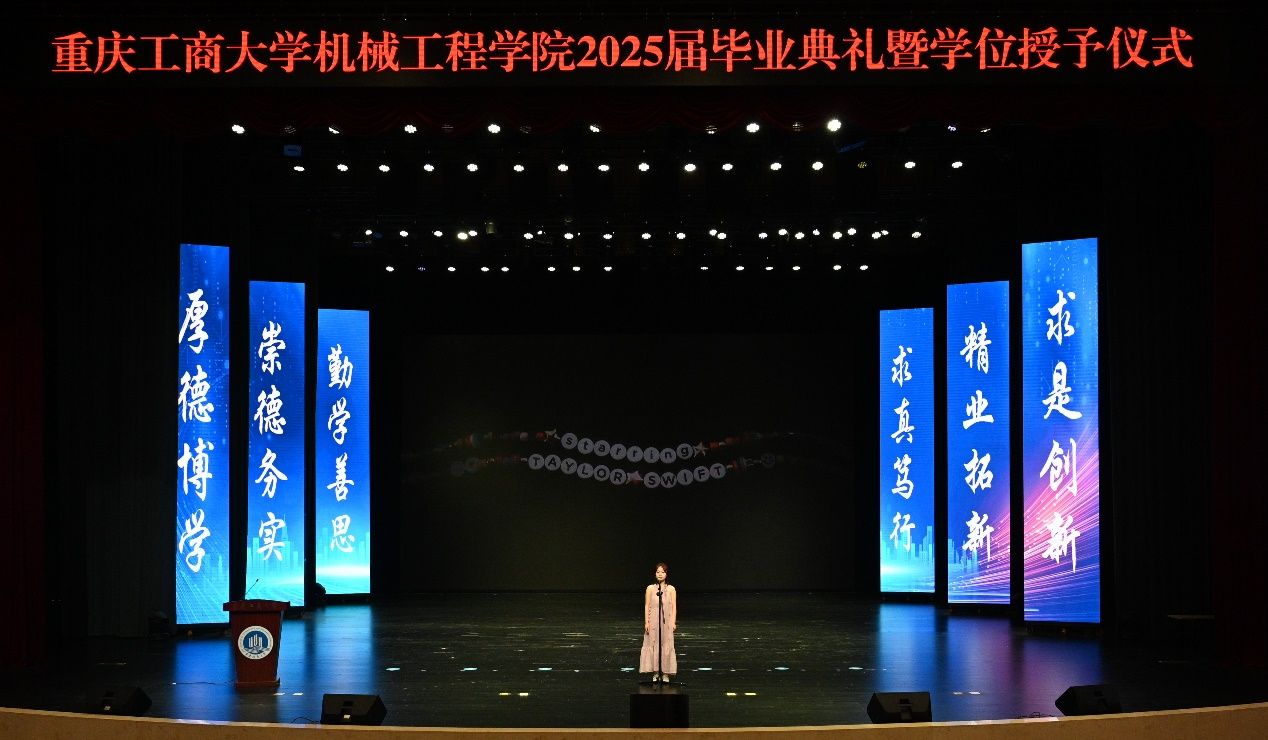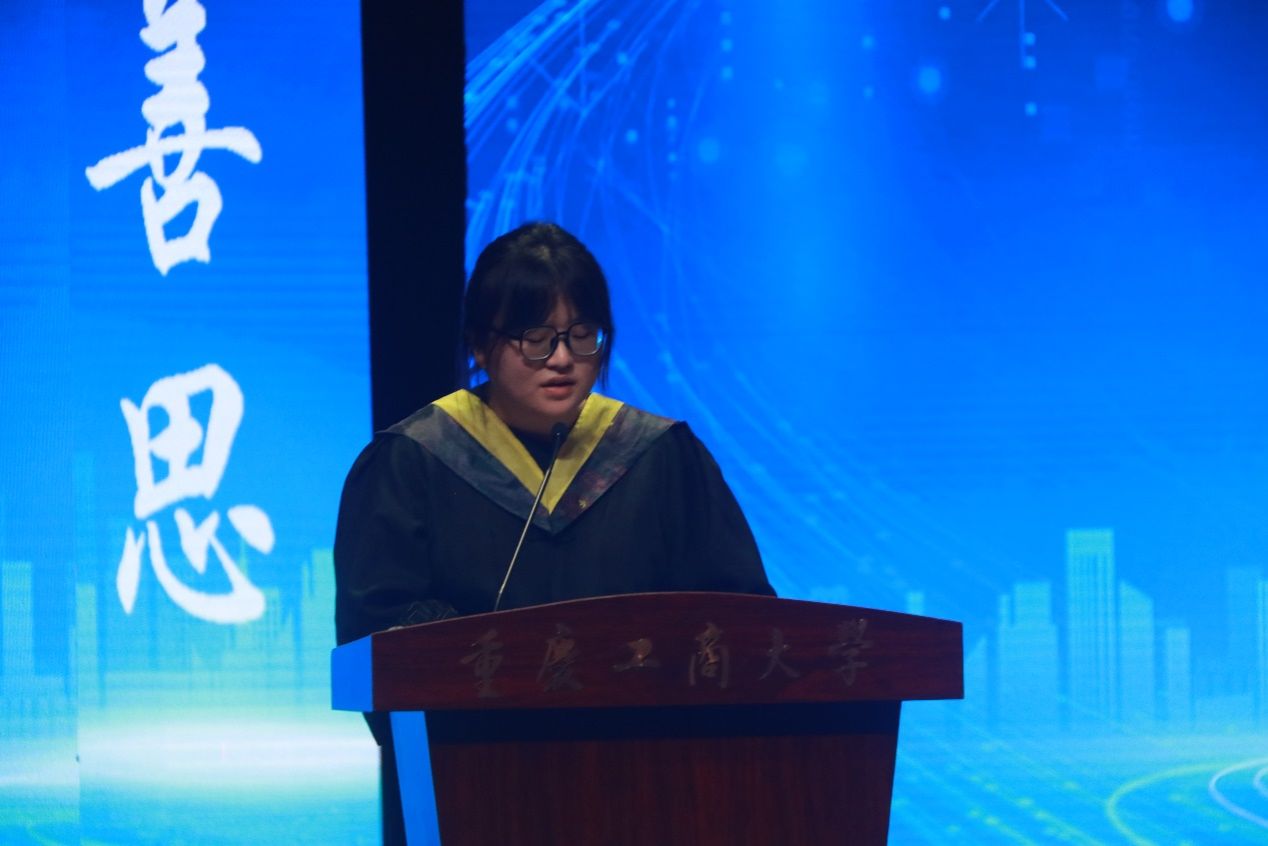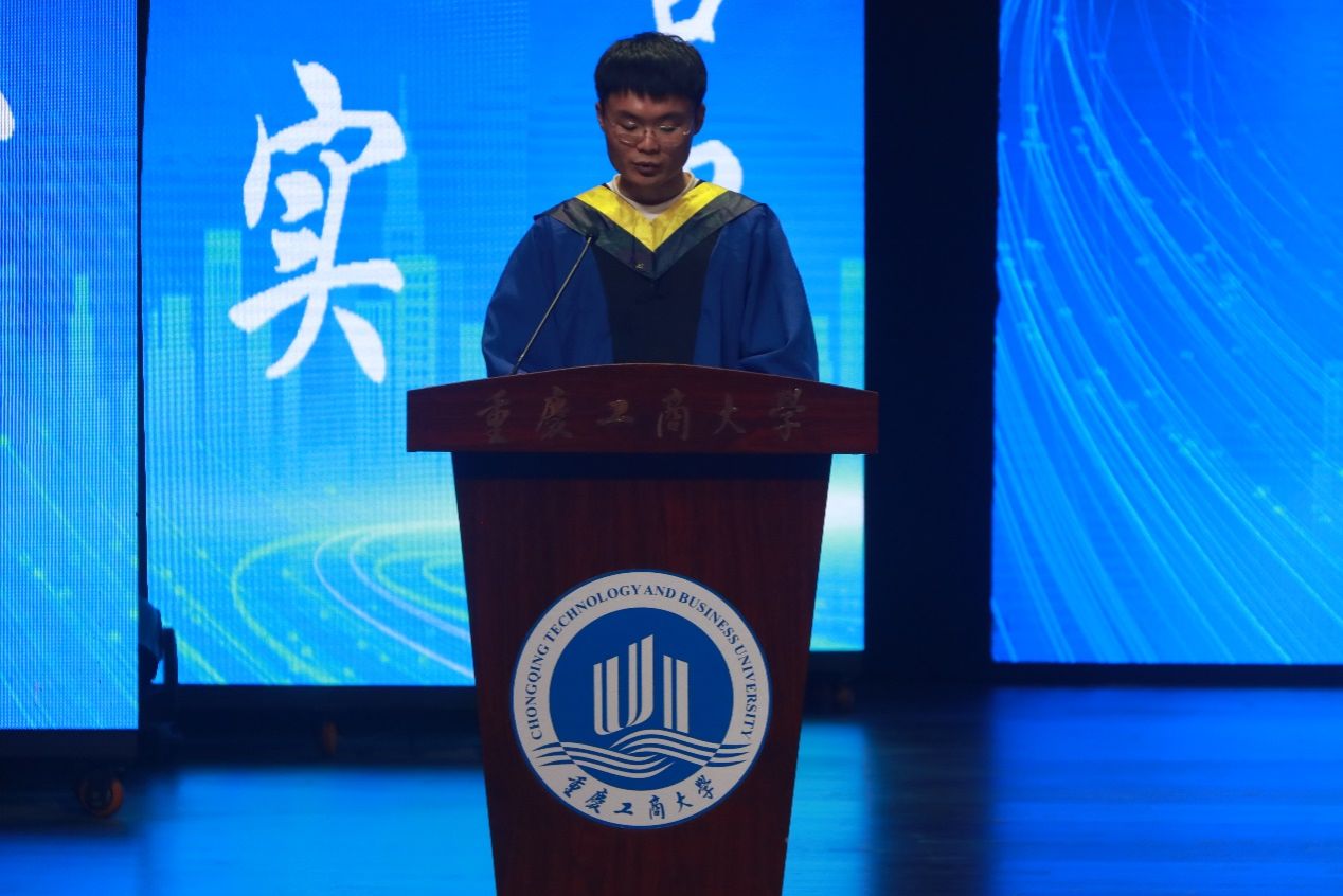 重庆市 “优秀毕业生”、2021 级智能制造一班唐蕊同学作为本科生代表发言,她分享了大学时光的成长与收获,表达了对母校和老师的感恩之情。重庆市 “三好员工”、2022 级硕士研究生徐永航同学则代表硕士研究生发言,回顾了研究生阶段的青春岁月,鼓励同学们勇敢奔赴未来。