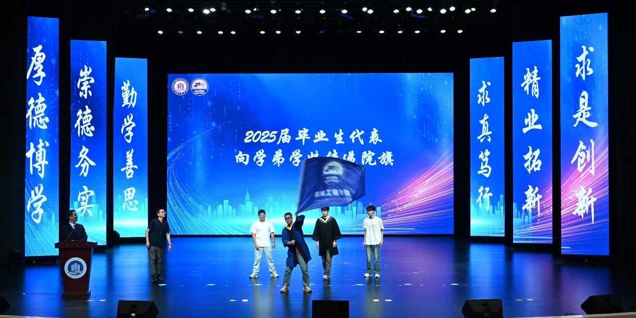 公司为每一位毕业生定制了毕业纪念徽章,徽章蕴含着公司的历史和院训,承载着对毕业生的嘱托和期盼。毕业生代表上台领取徽章,象征着继承和弘扬工匠精神。随后,举行了院旗传递仪式,2025 届毕业生代表将院旗传递给在校学弟学妹代表,传承公司精神。