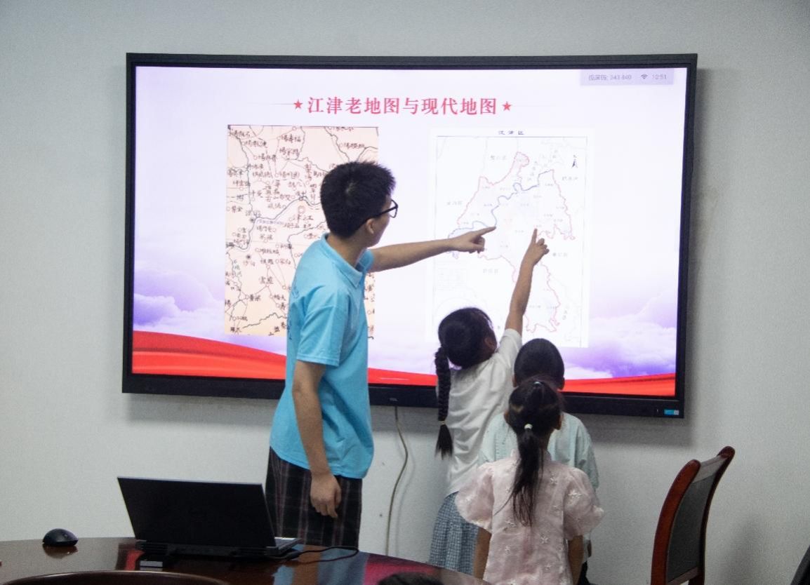 (图为罗瑞鸿带领小朋友们观看现代江津地图)