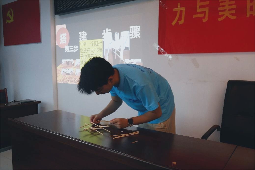 实践环节将课堂推向高潮。30余名员工分为6组,在团队协作中展开创意比拼。面对“仅用一次性筷子、胶水和棉线搭建承重桥梁”的挑战,小工程师们迅速进入状态:第一组采用“三角桁架结构”,强调稳定性;第二组尝试“双层拱形设计”,追求承重极限;第三组别出心裁地融入“彩虹斜拉桥”造型,兼顾美学与功能。过程中,实践团成员穿梭于各组之间,手把手指导“结构对称性调整”“节点加固技巧”,并提醒员工关注“材料利用率”——“每一根筷子都是资源,如何用最少的材料实现最优性能?”这一环保理念引发员工深思。