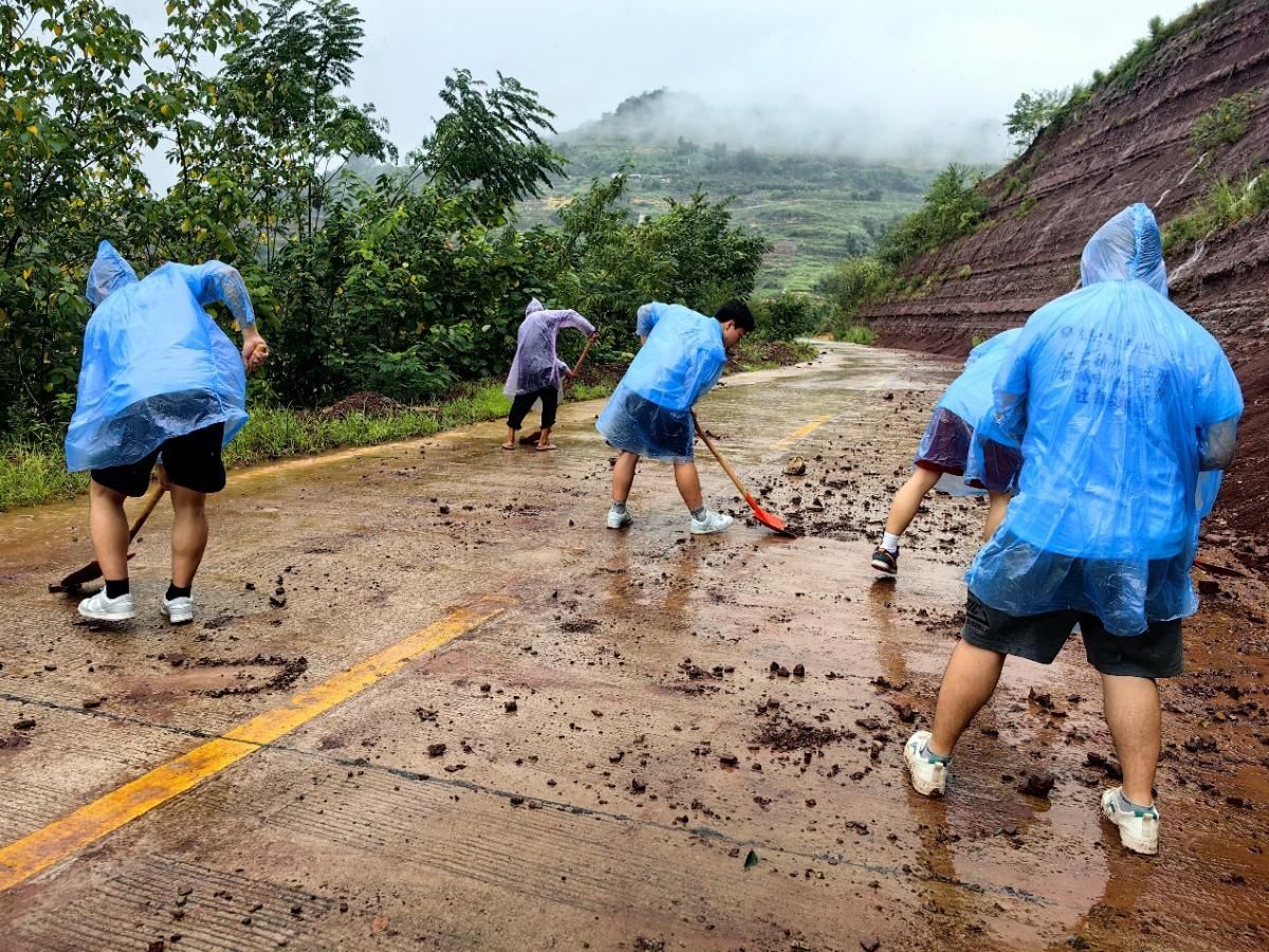 7月9号中午,同学们与白溪社区书记及当地村民一同来到落石路段。眼前的景象让人揪心,大小不一的石块散落一地,有些还夹杂着泥沙,整个路面一片狼藉。大家迅速从社区借来铲子等工具,投入到清理工作中。陈源、杨竣然、徐振超和书记、村民们一起,有的拿着铲子奋力铲除路面上的碎石和泥沙,铲子与地面碰撞发出 “叮叮当当” 的声响,奏响了抢险的序曲;有的则合力搬运稍大些的石头,累得满头大汗也顾不上擦。