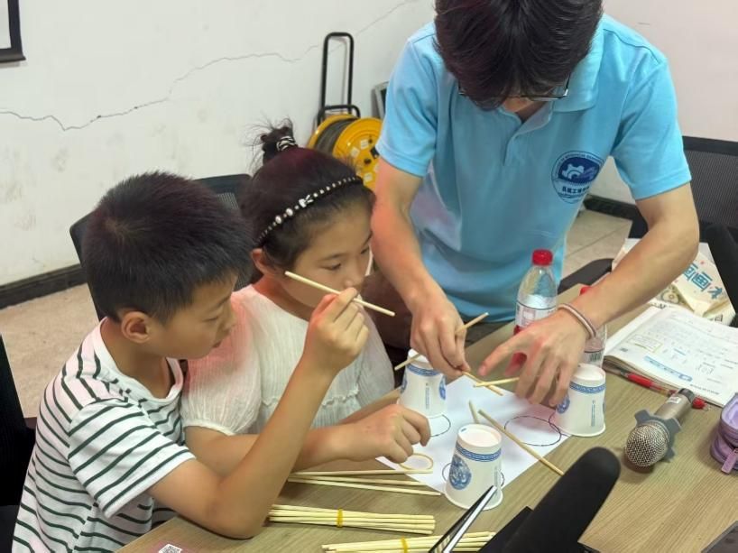 起初孩子们把筷子随意叠放,搭好的“桥”一碰就散。指导同学没有直接帮忙,而是指出其中问题,经过三次调整,孩子们然用6根筷子搭出稳定桥墩。另一边,4名孩子合作的拱桥已初具雏形,既保证结构稳定又增添创意。