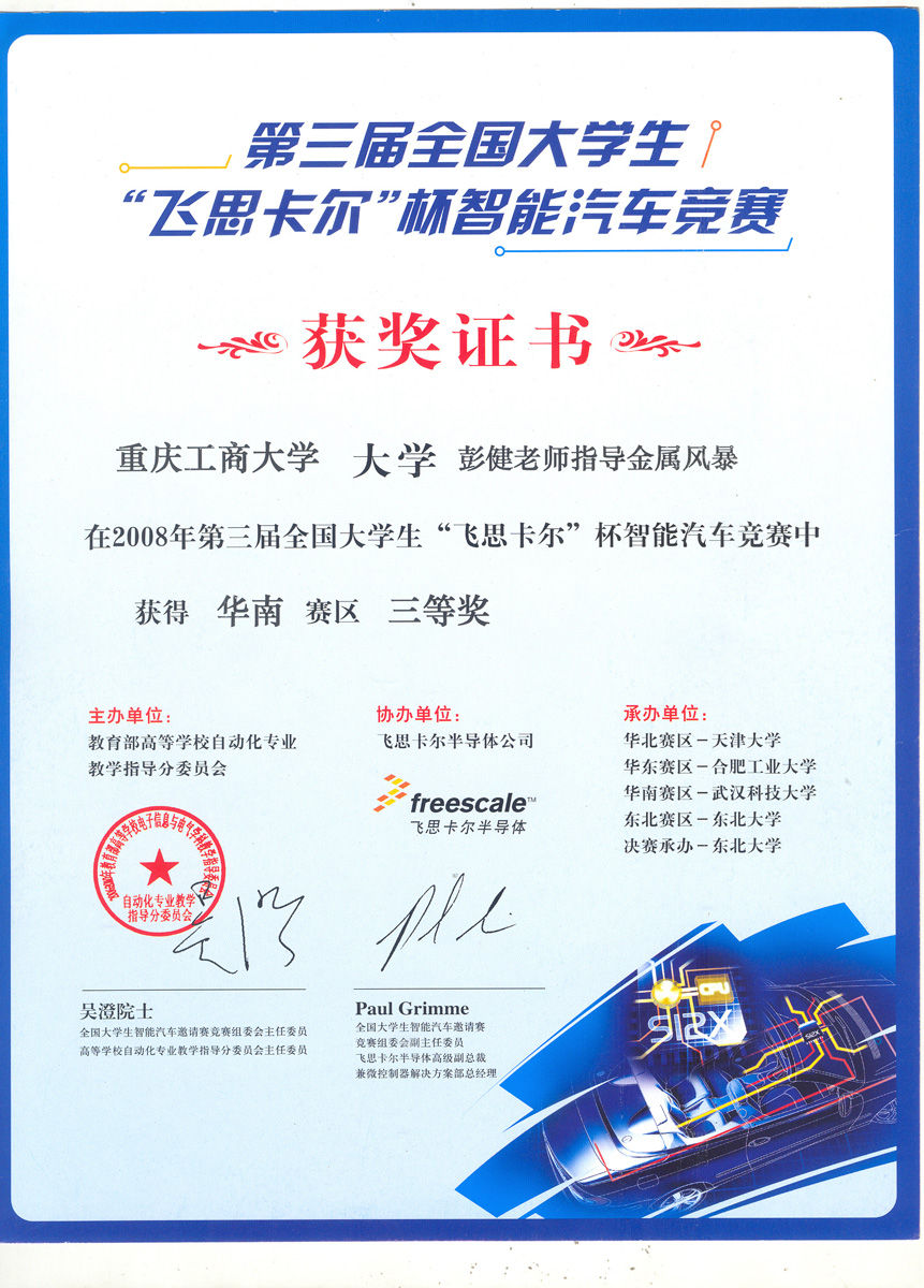 由教育部高等教育司主办的第三届全国老员工“飞思卡尔”杯智能汽车竞赛华南赛区的比赛于2008年7月23日在武汉科技大学体育馆落下帷幕。来自华南及西南地区11个省、自治区、直辖市的47所大学的 146支参赛队伍(光电组72支,摄像头组74支)参加了角逐。重庆工商大学机械与包装工程公司组队参加了此项比赛,并获得华南赛区的三等奖。