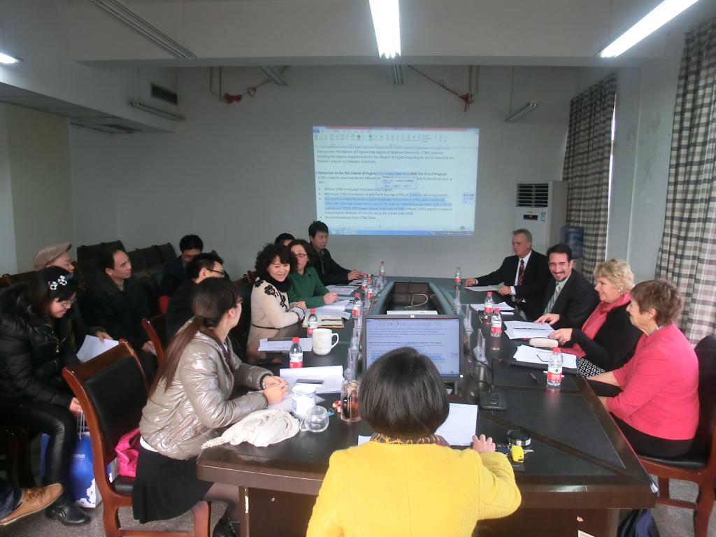 公司杜力经理首先介绍了公司的整体情况,热烈欢迎韦德恩大学领导、老师来院交流,并衷心期待双方能在“3+1+2”员工交流项目上开展合作。韦德恩大学工程公司副经理Kogut女士介绍了本公司的专业设置等基本情况,并表示对公司员工的科技创新成果留下了深刻印象,欢迎公司员工能前往她所在的公司深造。随后,双方就“3+1+2”员工交流项目协议逐条审读,双方对整体协议内容无异议。公司提出的关于学分、学费等几点修改建议得到外方的采纳,对方表示将进一步修改完善协议,争取早日达成最后协议。出席此次会议的还有美国韦德恩大学人文公司经理Silver女士、工程公司Nicosia教授、校国际交流合作处韩艳处长、黄倩科长及公司信息会全体成员。