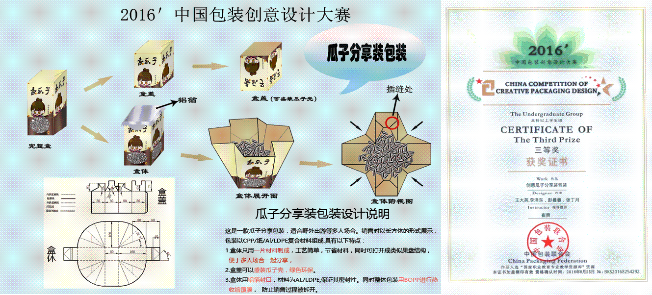 2013级包装班李泽东团队在导师崔爽的指导下,创新设计的“可折衣电熨斗包装”;2013级包装班陈军联、马丽艳创客团队,在导师张书彬的指导下,创新包装设计作品“便携化妆品旅行装”和“基于儿童安全的药品包装设计”,三项作品荣获2016年中国包装创意设计二等奖。2013级包装班李泽东团队创新设计的“瓜子分享装包装”、彭曼曼团队创新设计的“创意易开油漆桶”包装、蹇小凤创客团队创新设计出“功能型袜子包装”、冯德荣创客团队创新设计出“可回收式口香糖环保包装”、徐娇创客团队创新设计的“巧克力拼图包装”等五项作品荣获全国三等奖。