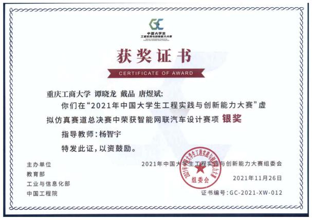 本届赛事,重庆工商大学师生参加了智能网联汽车设计分项赛、工程基础赛道、“智能+”赛道和企业运营仿真分项赛。在重庆市教委组织的省赛阶段,公司师生在智能网联汽车设计分项赛获得了特等奖2项、一等奖2项、二等奖2项、三等奖4项的优异成绩。其中,智云队(18级智能制造班谭晓龙、18级机械设计及其自动化班戴品、17级汽车服务工程班唐煜斌,指导教师:杨智宇)获得省赛第一名,作为重庆市智能网联汽车设计分项赛唯一代表参加国赛。
