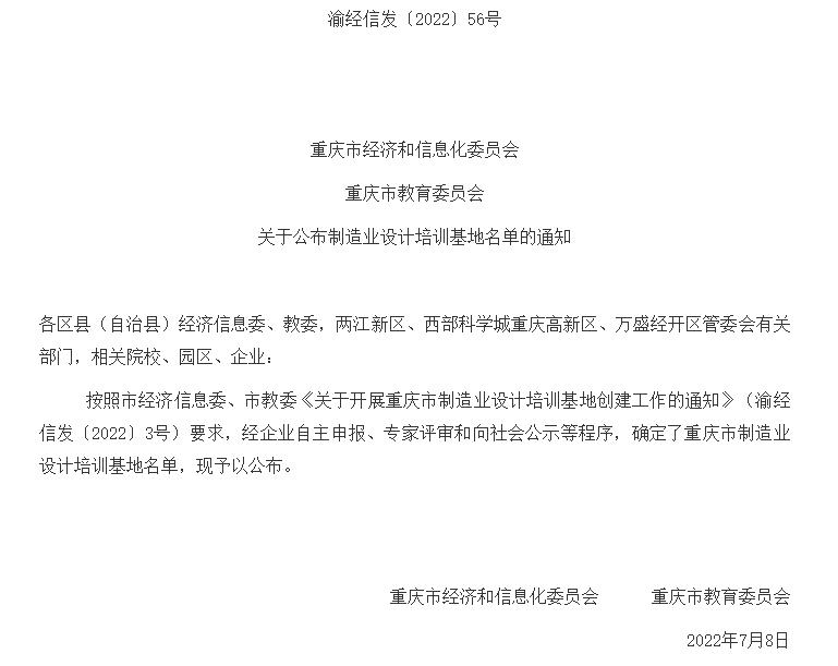 从重庆市经济和信息化委员会公布了重庆市制造业设计培训基地入选名单,公司获批重庆市制造业设计培训基地。