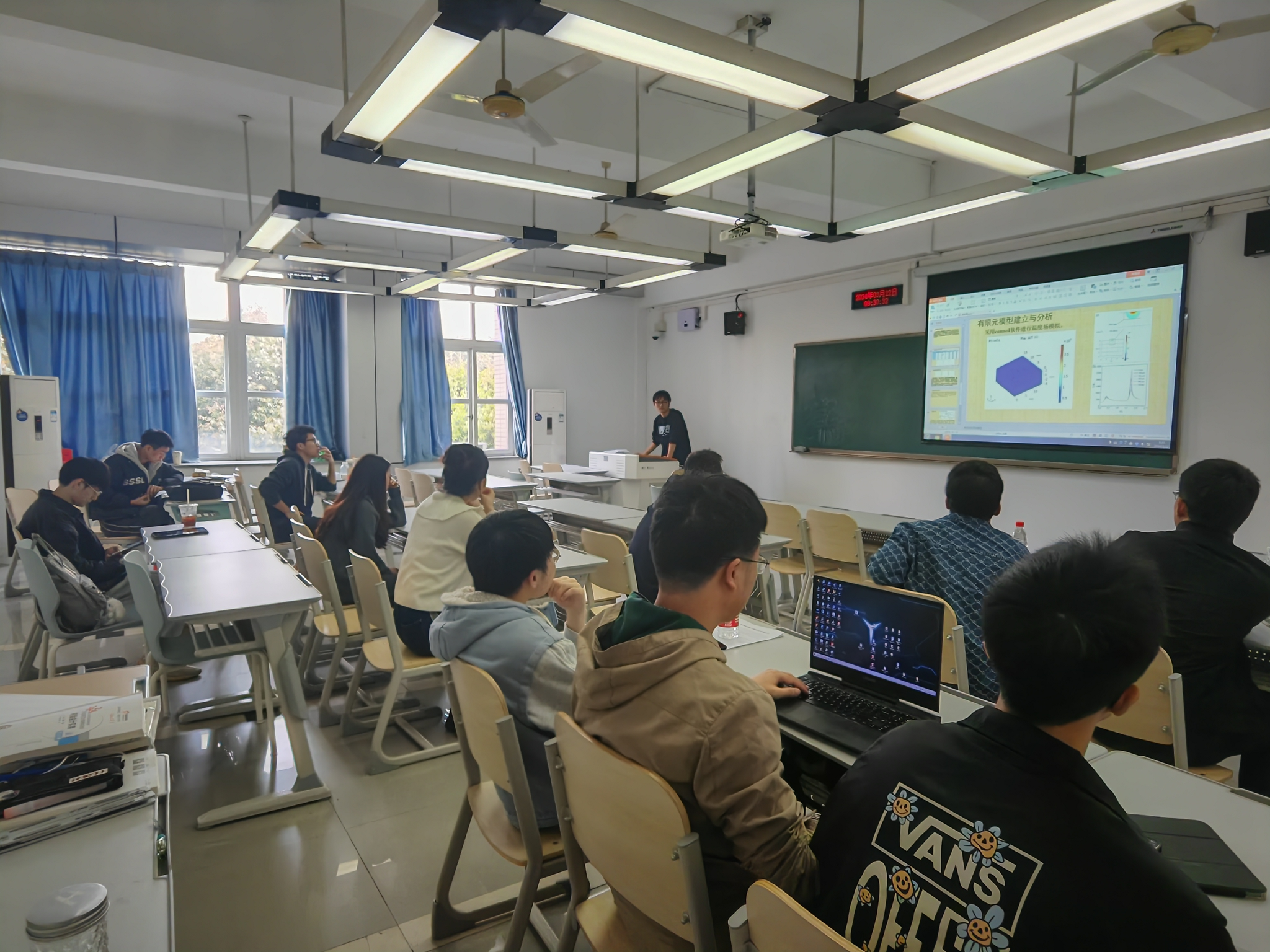 本次论坛,8位研究生依次上台汇报各自研究的进展和取得成果。徐永航在《基于综合满意度函数的D2钢激光抛光工艺参数优化方法》的报告中,详细阐述了如何利用改进的综合满意度模型以提高激光抛光效果,对D2钢激光抛光工艺参数的寻优提供借鉴,为激光抛光技术的发展提供了新的思路。徐彬源围绕《H13钢激光抛光参数优化及表面形貌组织分析》进行了汇报,深入探讨了H13钢激光抛光过程中的三维瞬态有限元模型,并采用X射线衍射仪对抛光后材料的表面形貌和组织进行了详细分析,为激光抛光工艺的应用提供了重要参考。彭康威就《Cr12MoV模具钢激光抛光裂纹产生机理与形貌特征研究》进行了分享,深入剖析了模具钢在激光抛光过程中裂纹产生的机理,并对裂纹的形貌特征进行了详细描述,为模具钢的激光抛光提供了理论支持。在机械电子工程领域,刘吉祥分享了《超声振动辅助激光抛光TC4熔池演变及温度场模拟》的研究成果,通过模拟分析了超声振动辅助激光抛光TC4材料时熔池的演变过程及温度场分布,为优化抛光工艺提供了理论依据。邱国航汇报了《基于挤压激励残差密集网络的红外与可见光图像融合研究》,介绍了如何利用深度学习技术对红外与可见光图像进行融合,提高图像的质量和信息的丰富度,为图像处理领域带来了新的突破。杜磊围绕《生活支援机器人仿生腰部的结构设计与控制研究》进行了分享,详细介绍了生活支援机器人仿生腰部的结构设计原理和控制方法,为机器人的实际应用提供了技术支持,展现了机械电子工程在机器人领域的广阔应用前景。胡力文带来了《针对工业机器人的能耗特性研究》的报告,深入分析了工业机器人在不同工作状态下的能耗特性,并提出了相应的节能措施,为工业机器人的能效提升提供了重要指导。最后,霍晨就《电场在耦合破乳脱水装置中的作用机理》进行了汇报,研究了电场在耦合破乳脱水装置中的作用机制,为装置的优化和改进提供了理论支持,展现了机械设计与理论在实际应用中的重要作用。